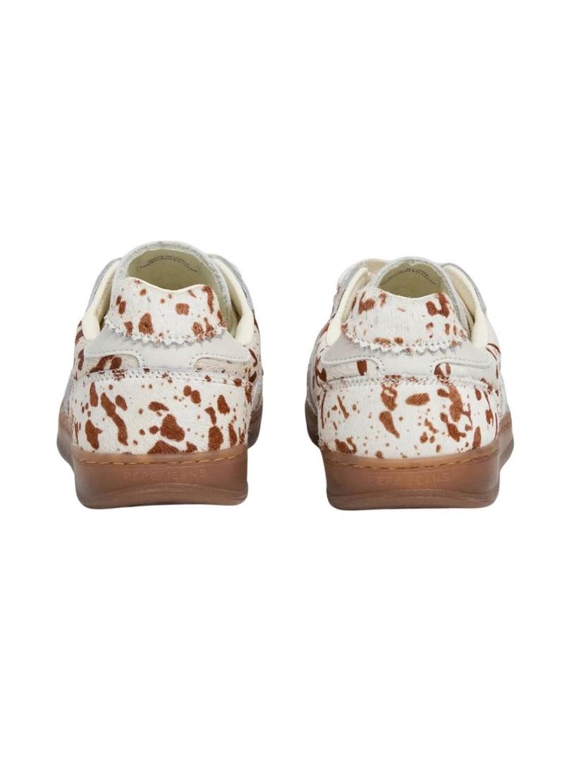 Tênis Pepe Jeans. Modelo Ball Chic. Cor branco e marrom. Fecho com cadarços. Parte superior em crina de cavalo. Estampa animal print. Logo selado nas laterais. Palmilha termoformada e removível. Sola cupsole de borracha em cor natural.