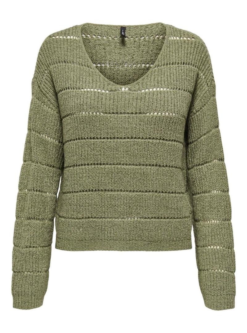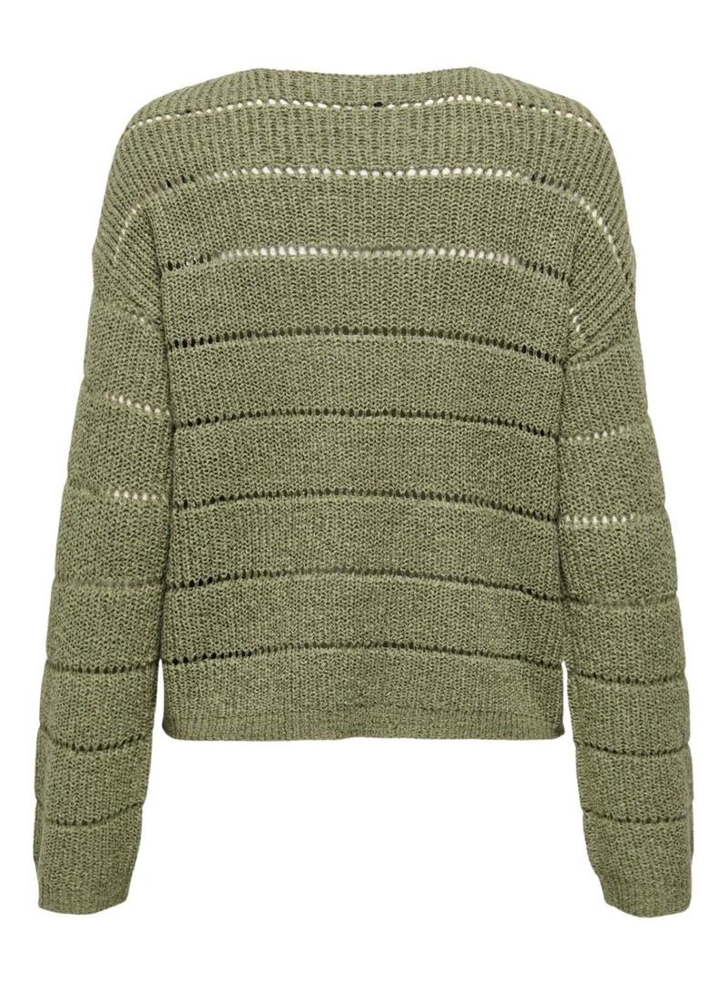 Camisola Apenas. Modelo Pamela. Cor verde. Ajuste folgado. Manga comprida. Decote em V. Ajuste regular. Rendados formando listras horizontais.