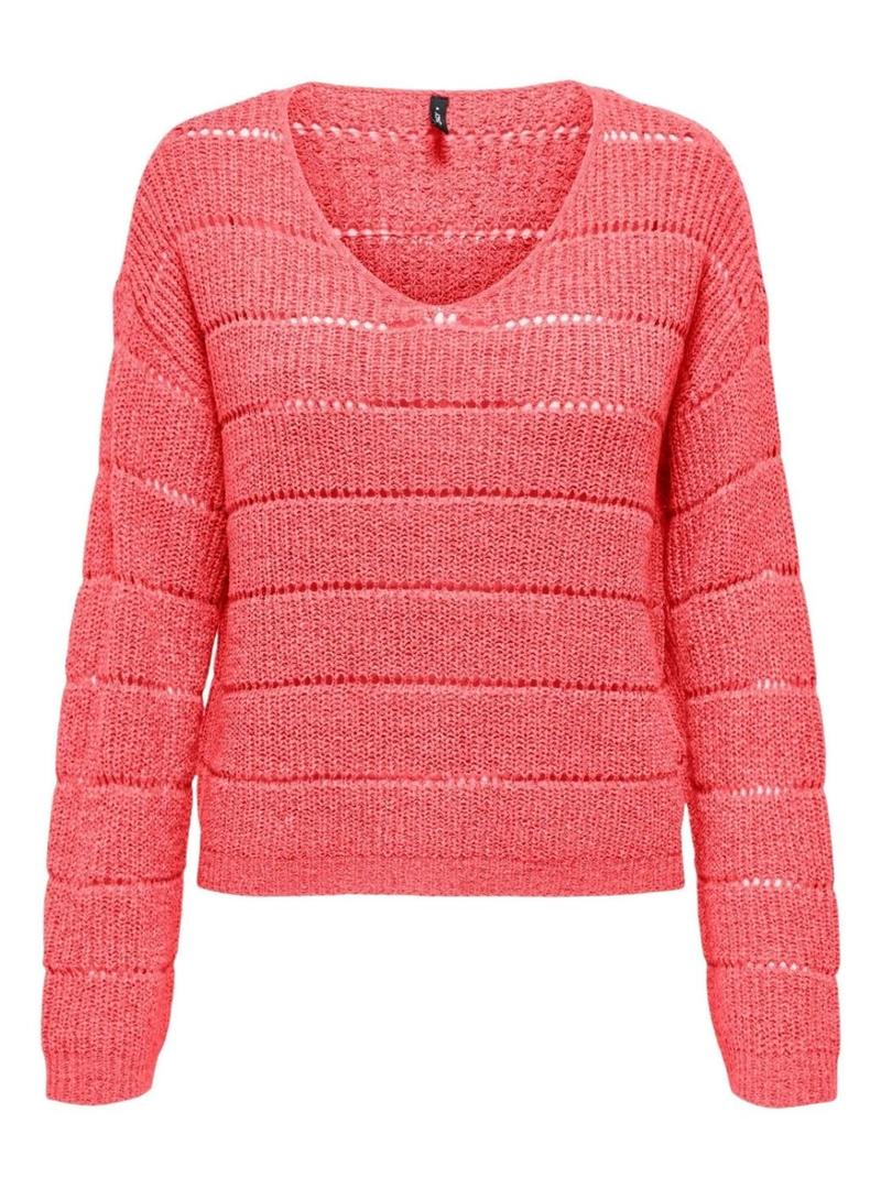 Camisola Only. Modelo Pamela. Cor coral. Ajuste folgado. Manga comprida. Decote em V. Ajuste regular. Calados formando riscas horizontais.