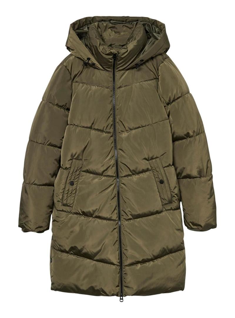 Casaco acolchoado Vila. Modelo Halsey. Cor verde. Gola alta. Fecho com zíper bidirecional. Capuz ajustável com elástico. Tecido acolchoado. Bolsos laterais com zíper. Aberturas laterais com botões de pressão. Extremidades das mangas elásticas.
