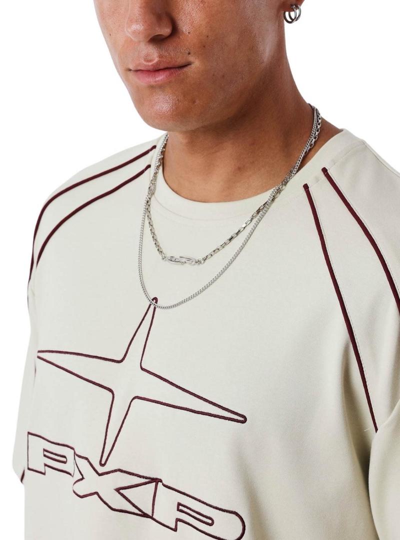 Camiseta Project x Paris. Modelo PXP. Cor bege. Ajuste folgado. Gola redonda. Manga curta. Logo bordado no peito em tamanho grande. Costuras estilo raglan em contraste. Detalhes em grená.