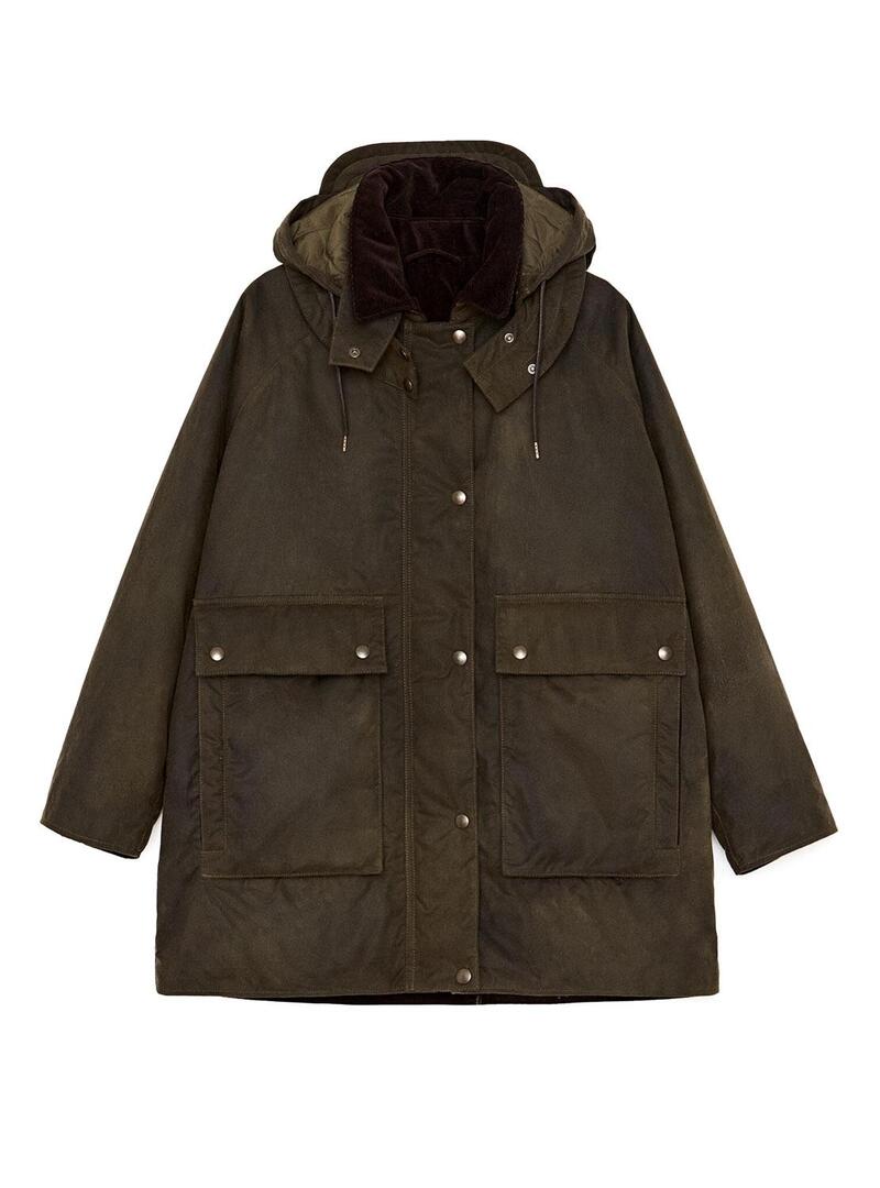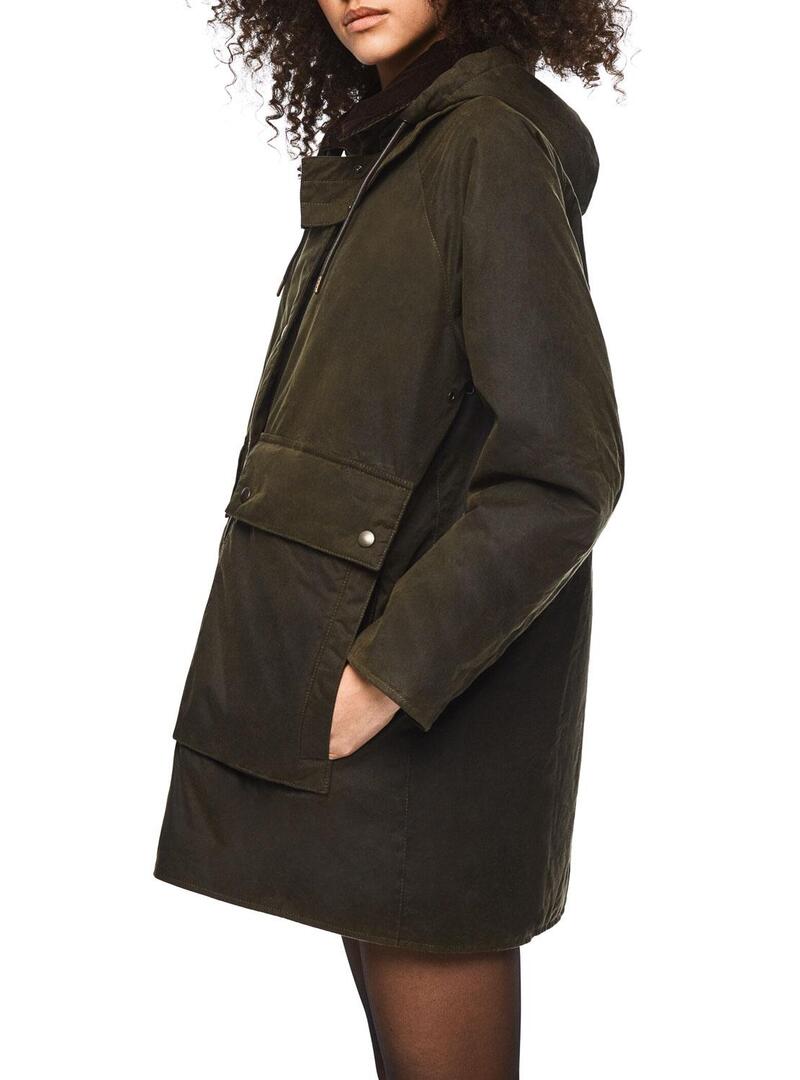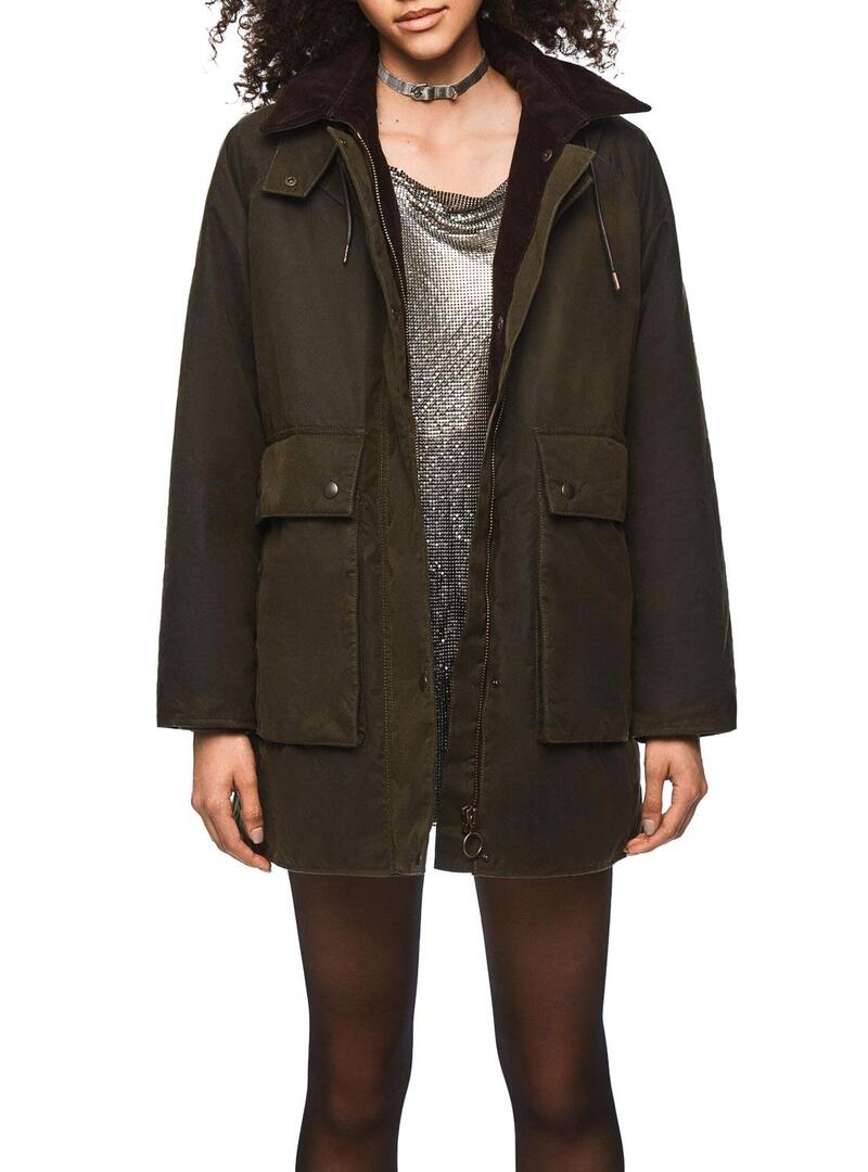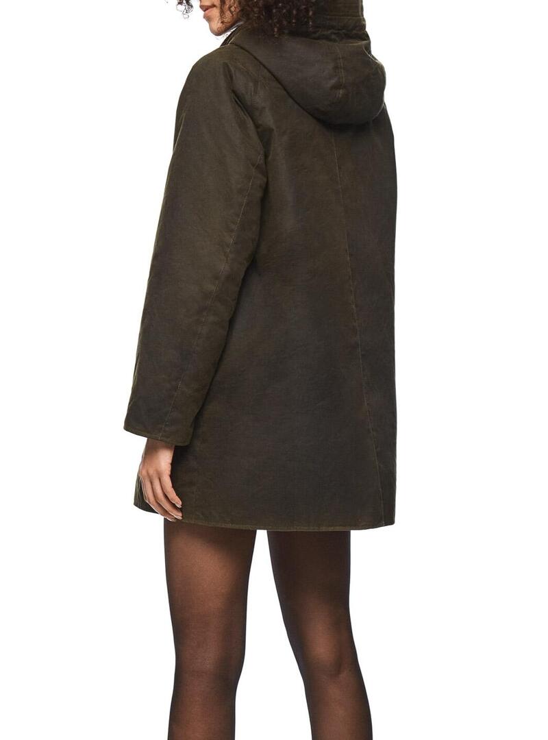 Parka Pepe Jeans. Modelo Corina. Cor verde. Coleção Dua Lipa. Tecido encerado Com capuz removível. Detalhes de veludo de algodão. Forro acolchoado Fecho con botãoen e zíper. Maxi bolsos frontais. Bolsos interiores A modelo está usando tamanho S.
