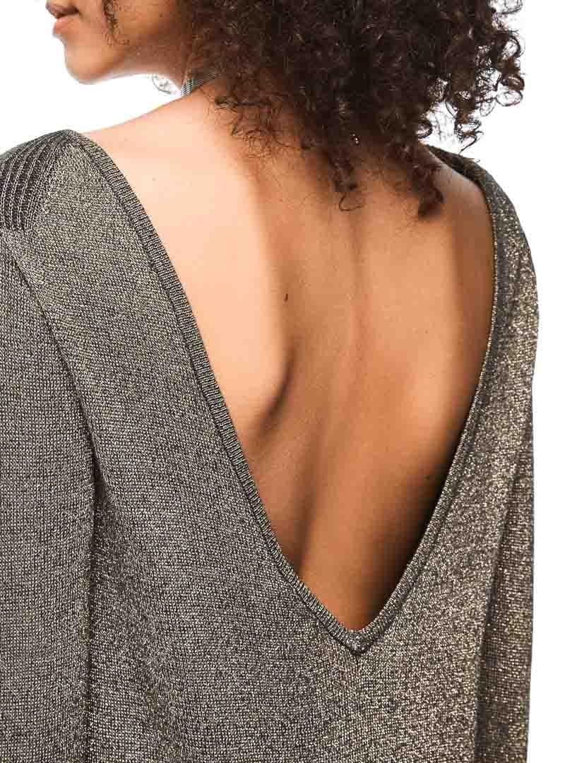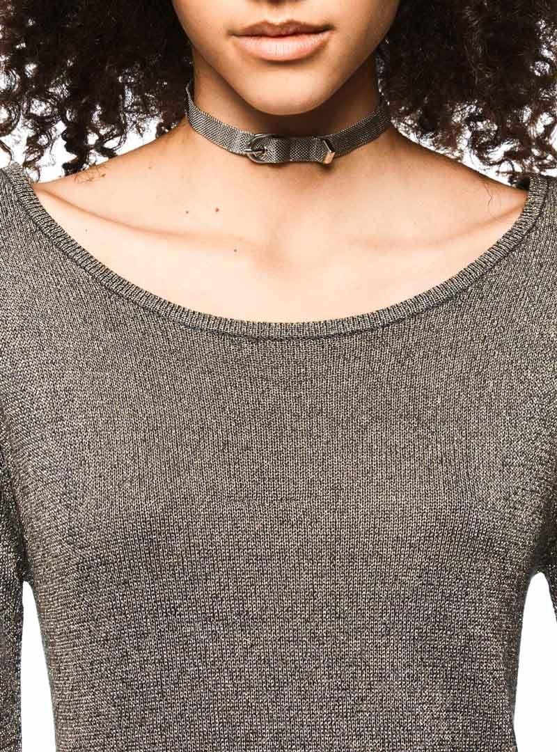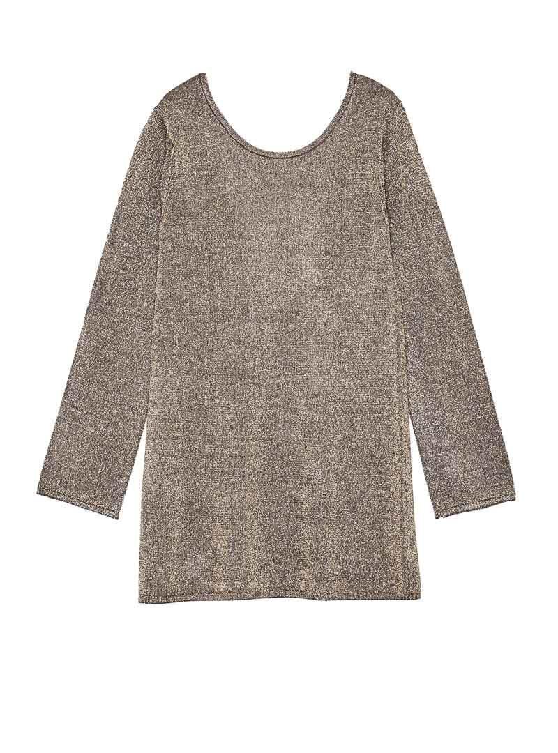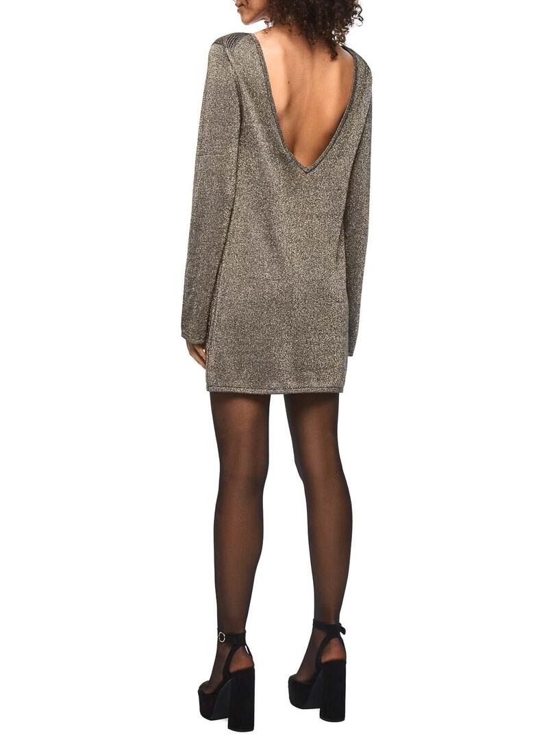 Vestido Pepe Jeans. Modelo Kate Coleção Dua Lipa. Tecido de efeito metálico Lurex con. Decote reedondo. Com ombreiras. Manga comprida. V. Voltar O modelo está usando tamanho S.