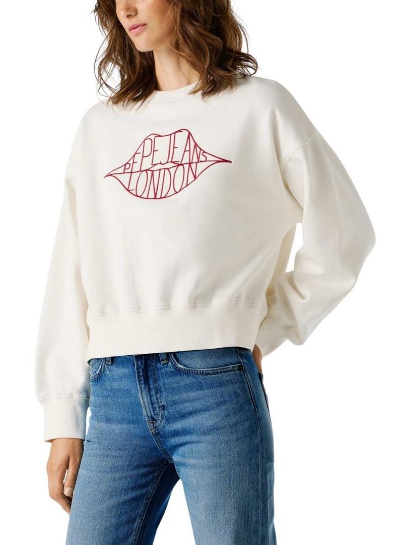 Moletom Pepe Jeans. Modelo Bernis. Cor branca. Gola redonda. Manga comprida. Extremidades caneladas. Ajuste folgado. Logo Pepe Jeans em forma de lábios bordado no peito em fio vermelho. Ombros caídos.