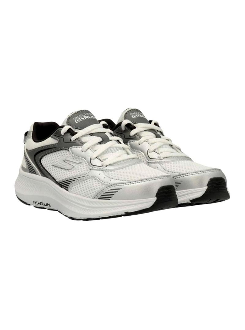 Tênis Skechers. Modelo GO RUN Consistent 2.0. Cor branca e preta. Parte superior em couro e malha. Detalhes em prateado. Logo lateral. Fechamento com cadarço. Amortecimento ULTRA LIGHT com retorno de energia. Tecnologia Skechers M Strike que favorece uma passada mais eficiente. Palmilha respirável Skechers Air-Cooled Goga Mat. Design de alto desempenho ideal para treinos.