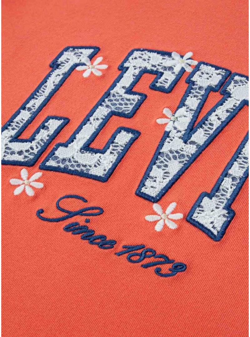 Camiseta Levis. Modelo Chambray Applique. Cor laranja. Gola redonda canelada. Manga curta. Decoração bordada com aplique de crochê.