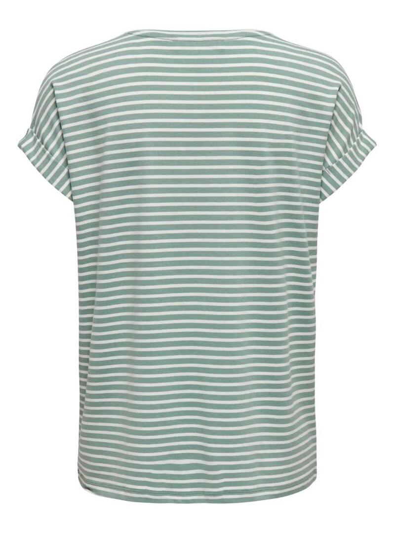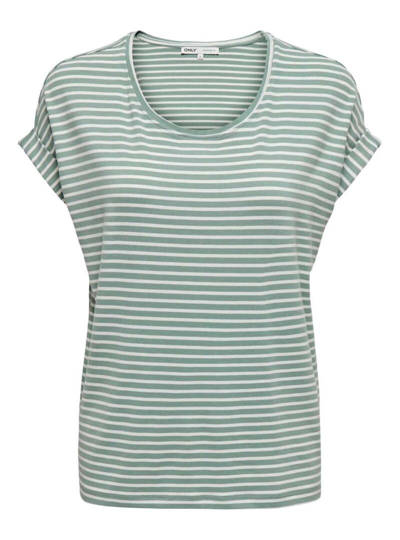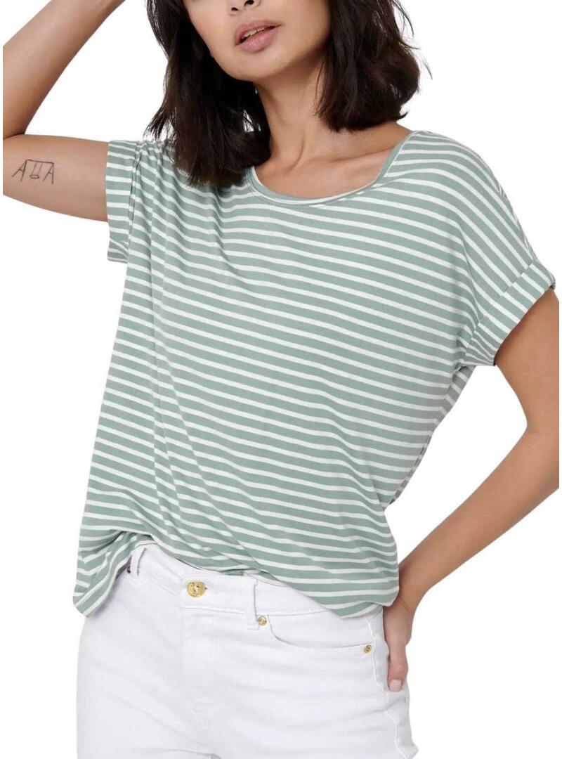 Camisa Only. Modelo Moster. Cor verde. Padrão às riscas. Gola redonda. Manga curta. Ombros ligeiramente caídos. Corte regular.