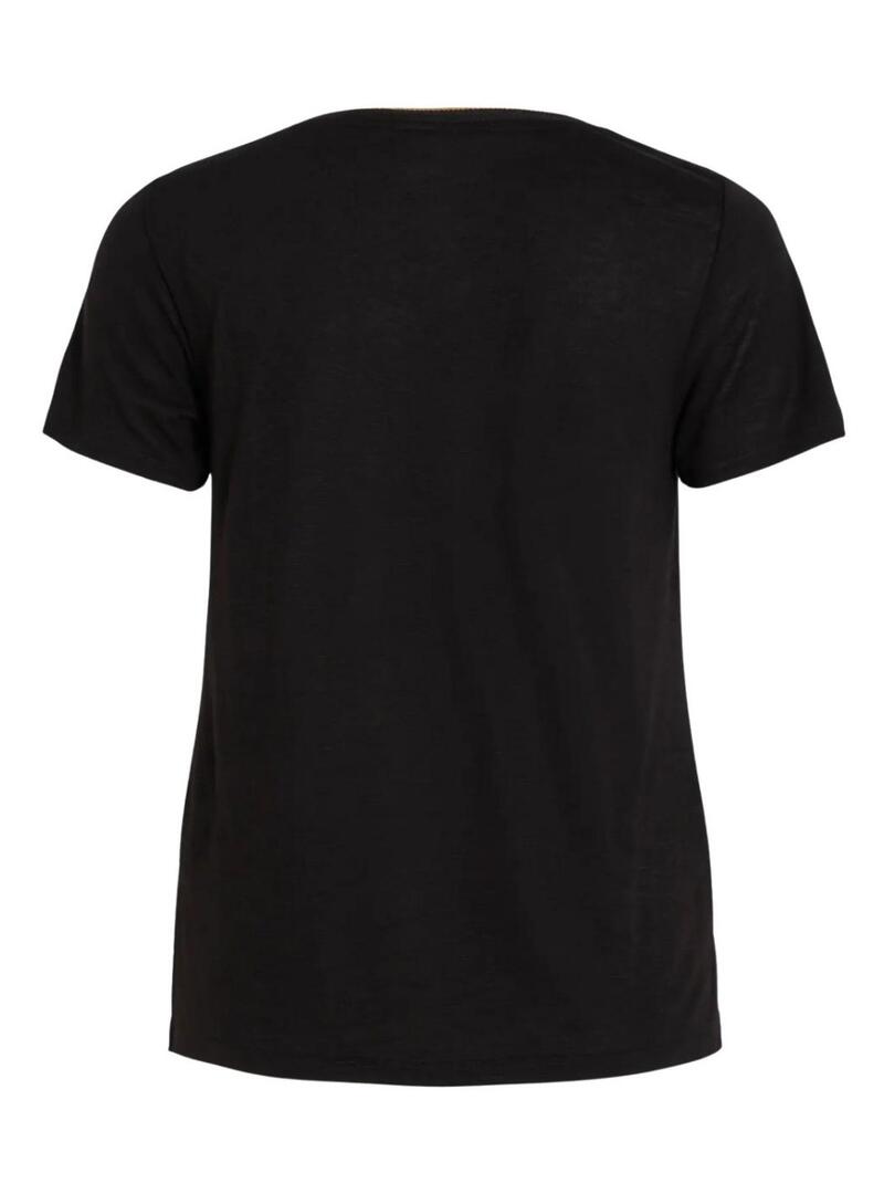 Camiseta Vila. Modelo Noel. Cor preta. Decote em V. Manga curta. Tecido mesclado. Decote com acabamento em canelado trançado com detalhes dourados. Borda levemente arredondada.