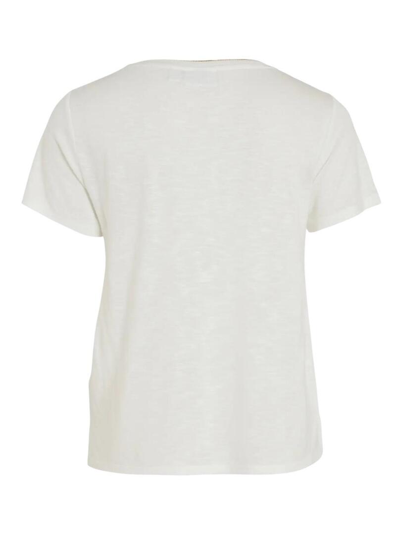 Camiseta Vila. Modelo Noel. Cor branca. Decote em V. Manga curta. Tecido jaspeado. Decote acabado em canelado trançado com detalhes dourados. Base levemente arredondada.