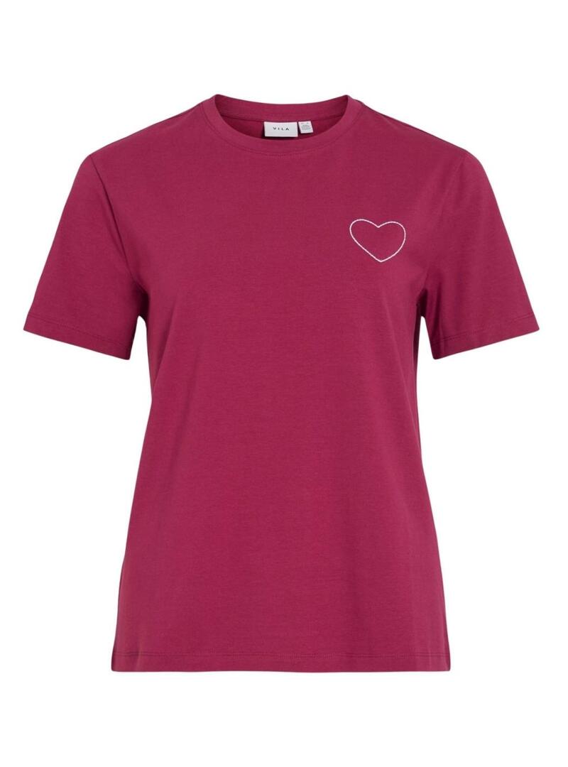 Camiseta Vila. Modelo Vinora. Cor bordô. Gola redonda. Manga curta. Corte regular. Comprimento clássico. Detalhe de coração bordado no peito.