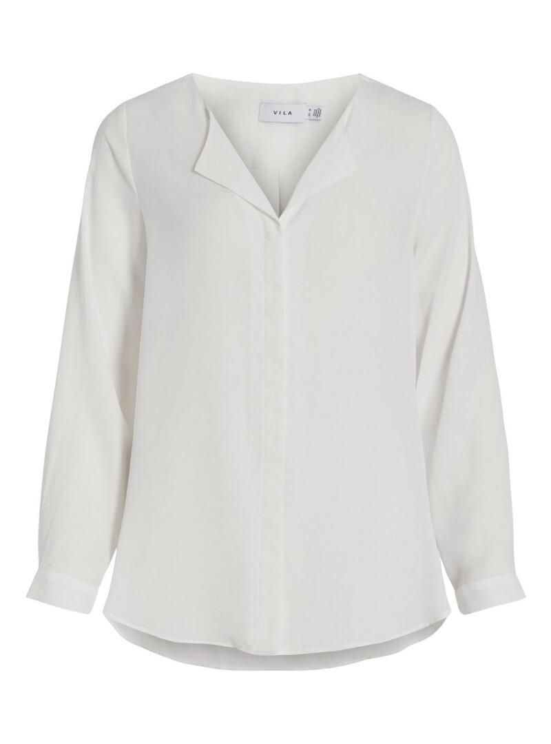 Camisa Vila. Modelo Lucy. Cor branca. Decote em V com lapelas. Fecho de botões ocultos. Punhos com botões. Tecido leve.