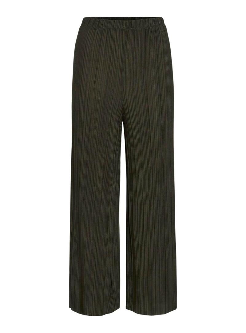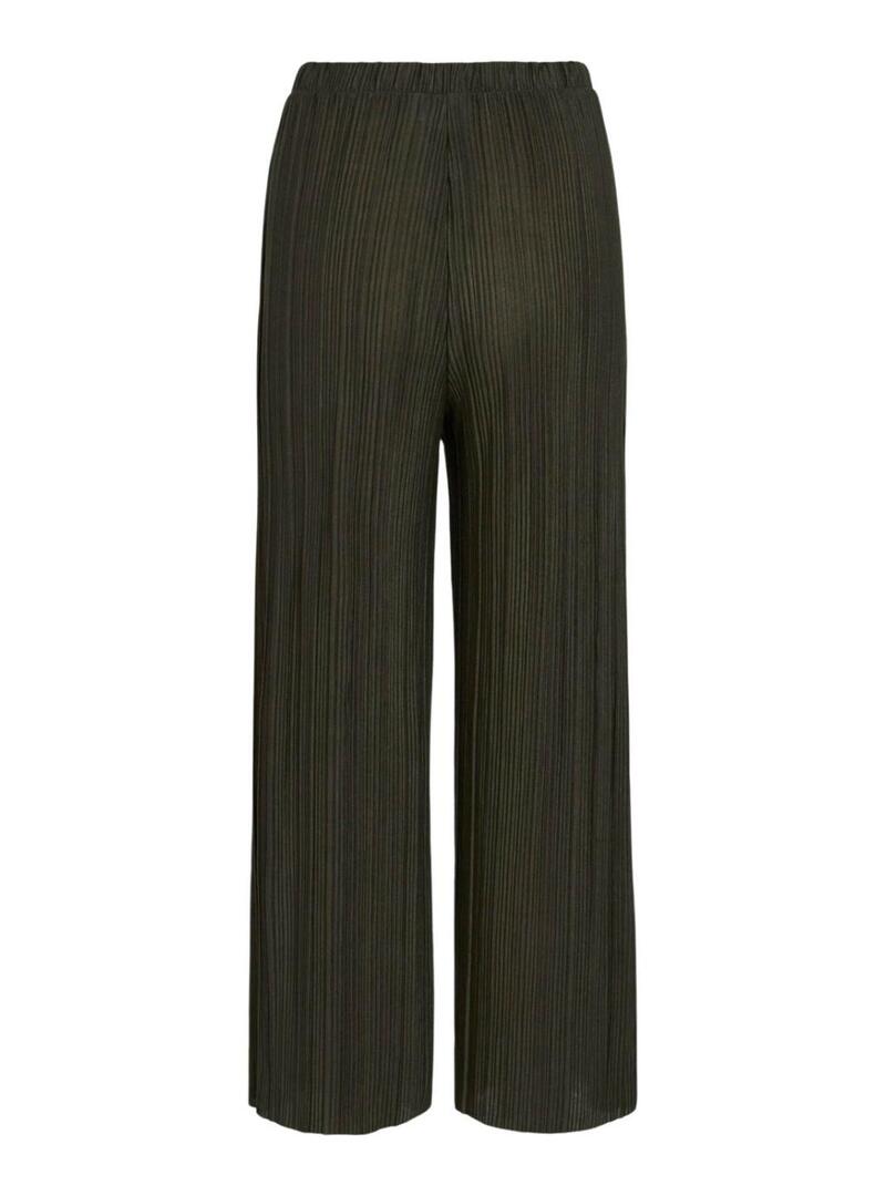 Calças Vila. Cor verde escuro. Modelo Viplisa. Formato culote. Cintura alta de elástico. Tecido plissado elástico. Corte regular. O modelo está vestindo o tamanho S.