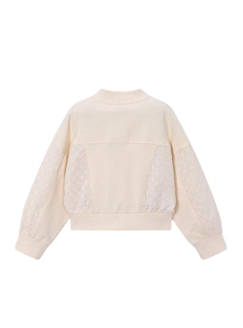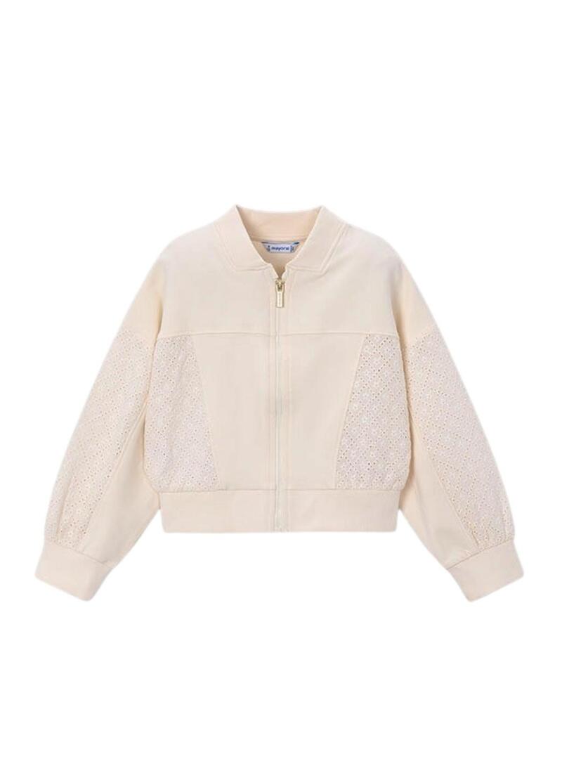 Moletom Mayoral. Cor bege. Manga longa. Fecho frontal com zíper. Acabamentos canelados. Detalhes vazados. Estilo bomber.