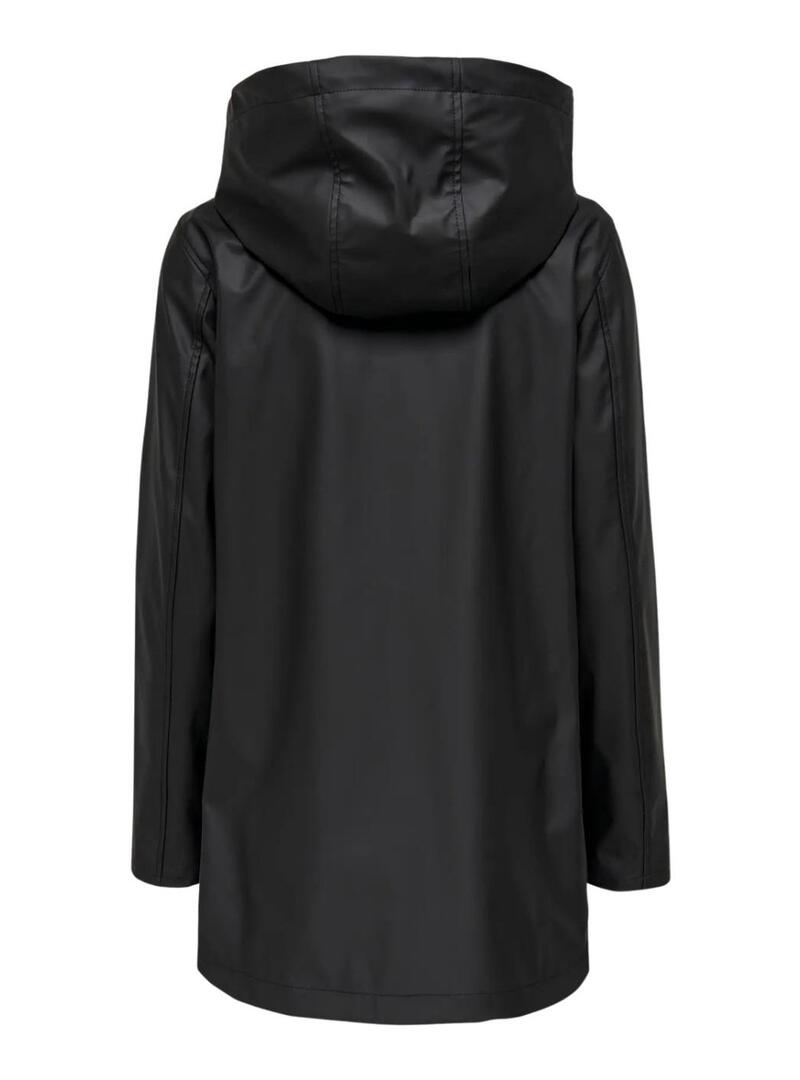 Casaco de chuva Only. Modelo Elisa. Cor preta. Capuz ajustável com cordão. Fecho de botões de pressão. Dois bolsos frontais com fecho de botões de pressão. Tecido impermeável.