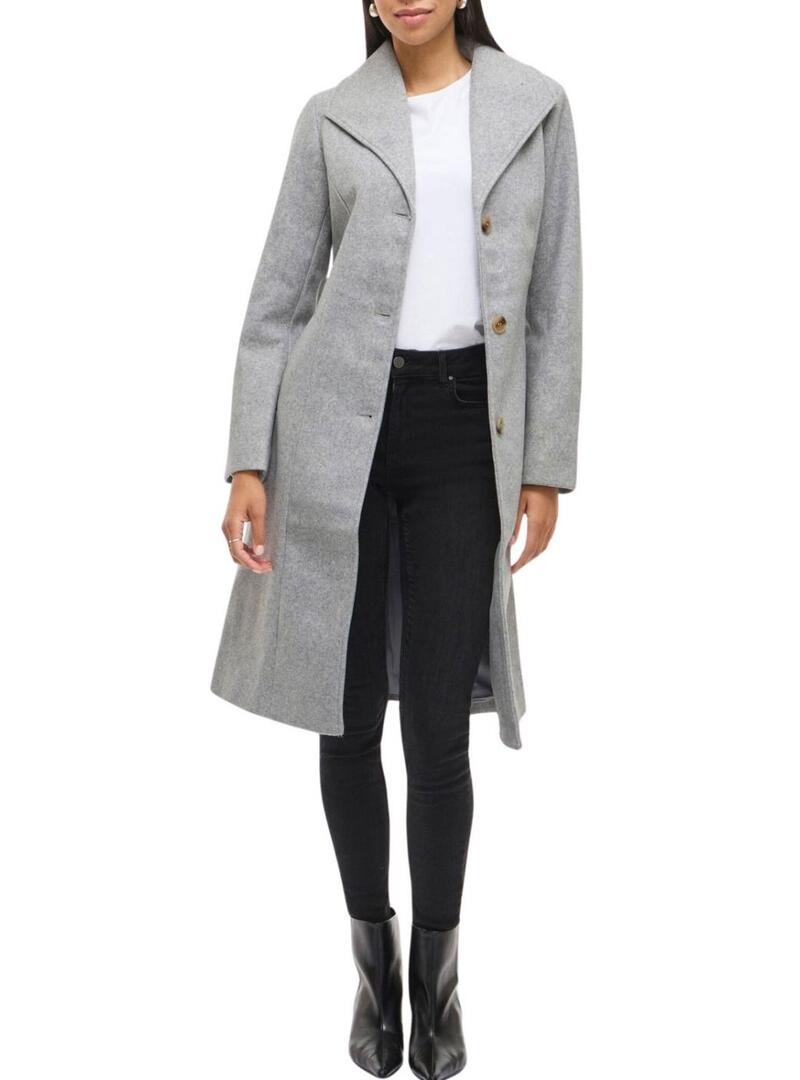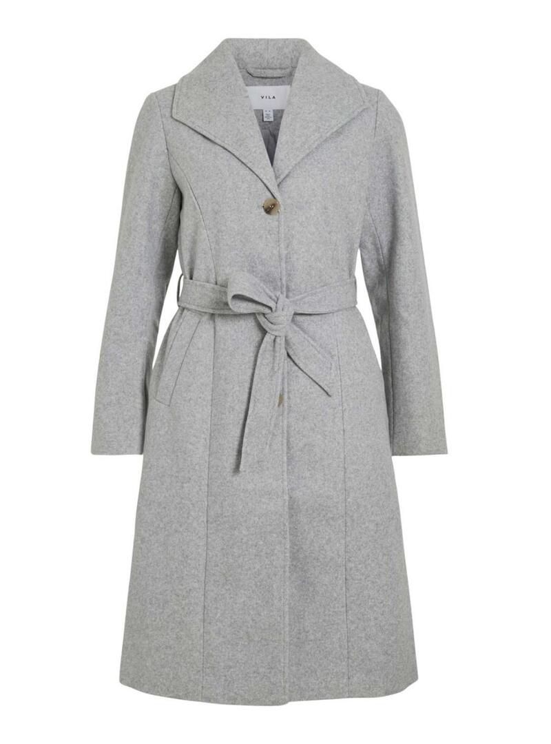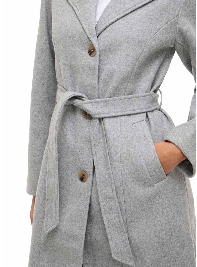 Casaco Vila. Modelo Claudine. Cor cinza. Corte clássico. Gola de lapela. Fechamento com botões. Laço na cintura com passadores. Forro interior. Corte regular. Bolsos laterais. Fenda traseira.