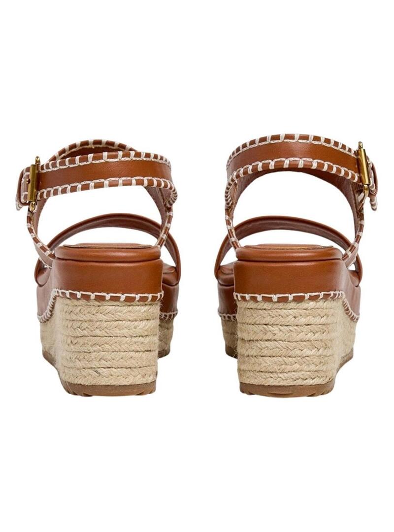 Sandálias Pepe Jeans. Modelo Billie. Cor marrom. Plataforma alta de juta natural. Design de tiras cor marrom. Fechamento no tornozelo com fivela metálica. Logotipo em relevo na parte superior. Altura do salto: 3 a 5cm.