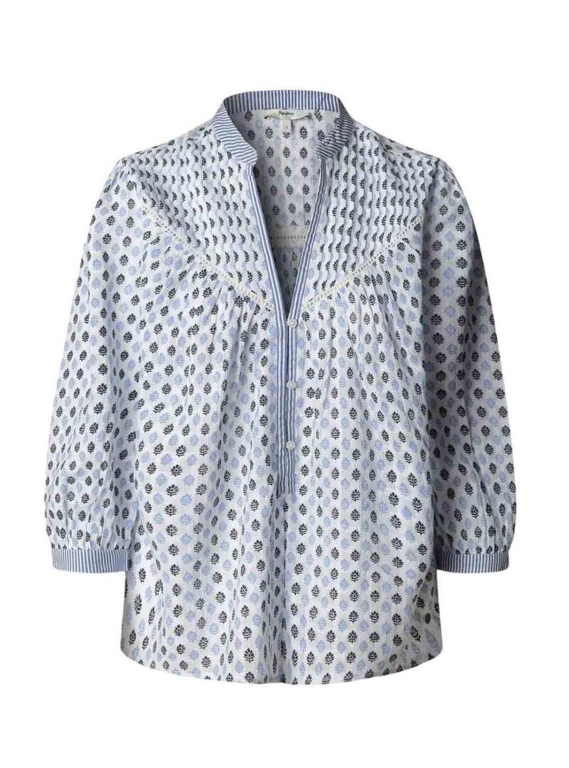 Camisa Pepe Jeans. Modelo Bloom. Cor azul. Estampa floral. Decote em V com carcela abotoada. Detalhes em contraste de listras. Mangas levemente bufantes. Comprimento da manga 3/4. Corte fluido.