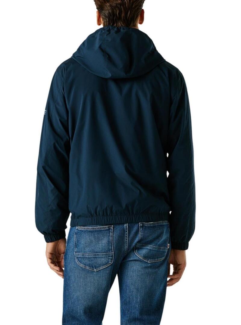 Casaco corta-vento Pepe Jeans. Modelo Sebulon. Cor azul marinho. Tecido leve de microfibra. Capuz ajustável com cordão elástico. Fecho frontal de zíper. Bolsos ocultos no peito. Patch com logo na manga. Bolsos laterais com acabamento em ribete. Punhos e barra elásticos. Puxador de borracha com logo estampado. Forro interno em contraste.
