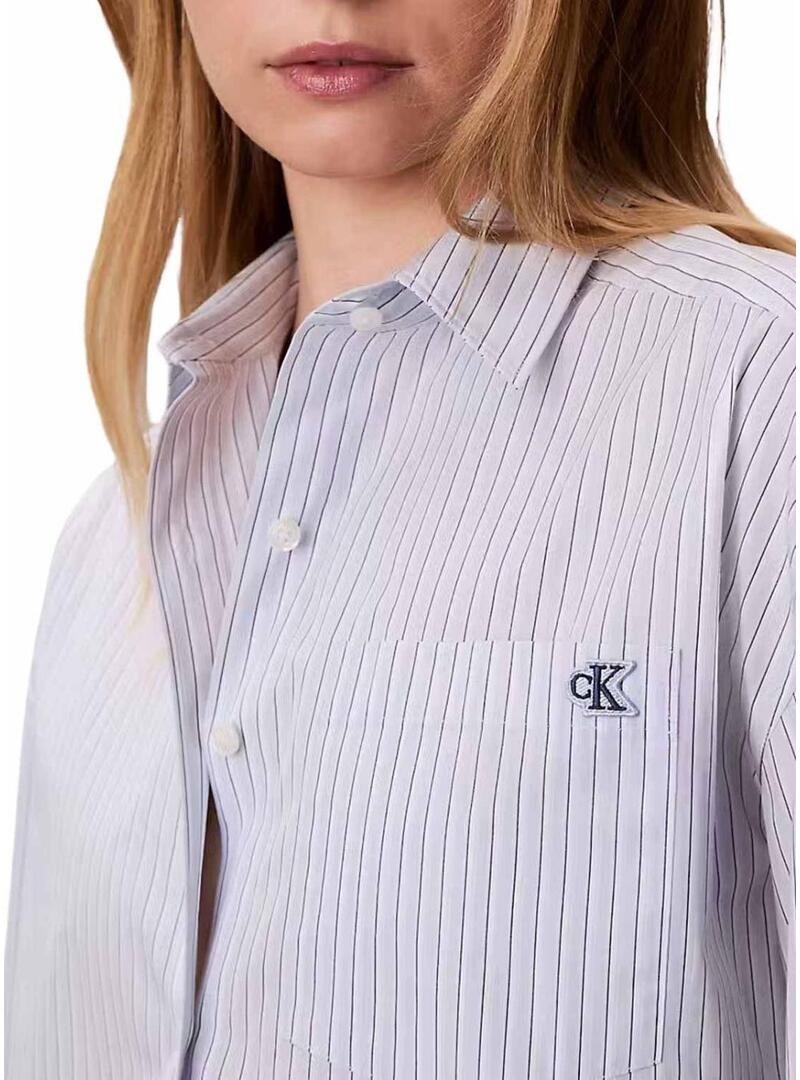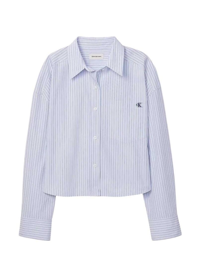 Camisa Calvin Klein Jeans. Modelo Yarndye. Cor azul. Tecido estampado com riscas verticais. Bolso de remendo no peito com logótipo bordado. Corte cropped. Ajuste folgado.