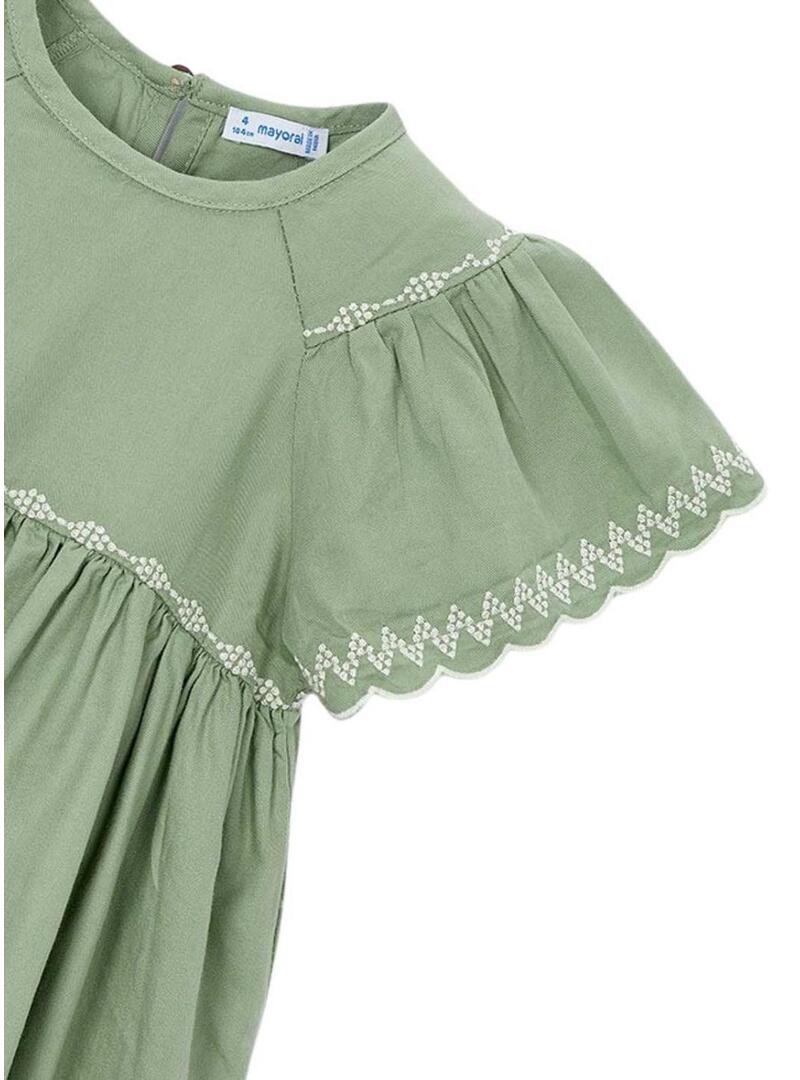 Vestido Mayoral. Modelo plissado. Cor verde. Fecho com botão atrás. Sem mangas. Tecido de chiffon leve plissado. Laço no ombro. Corte em linha A.
