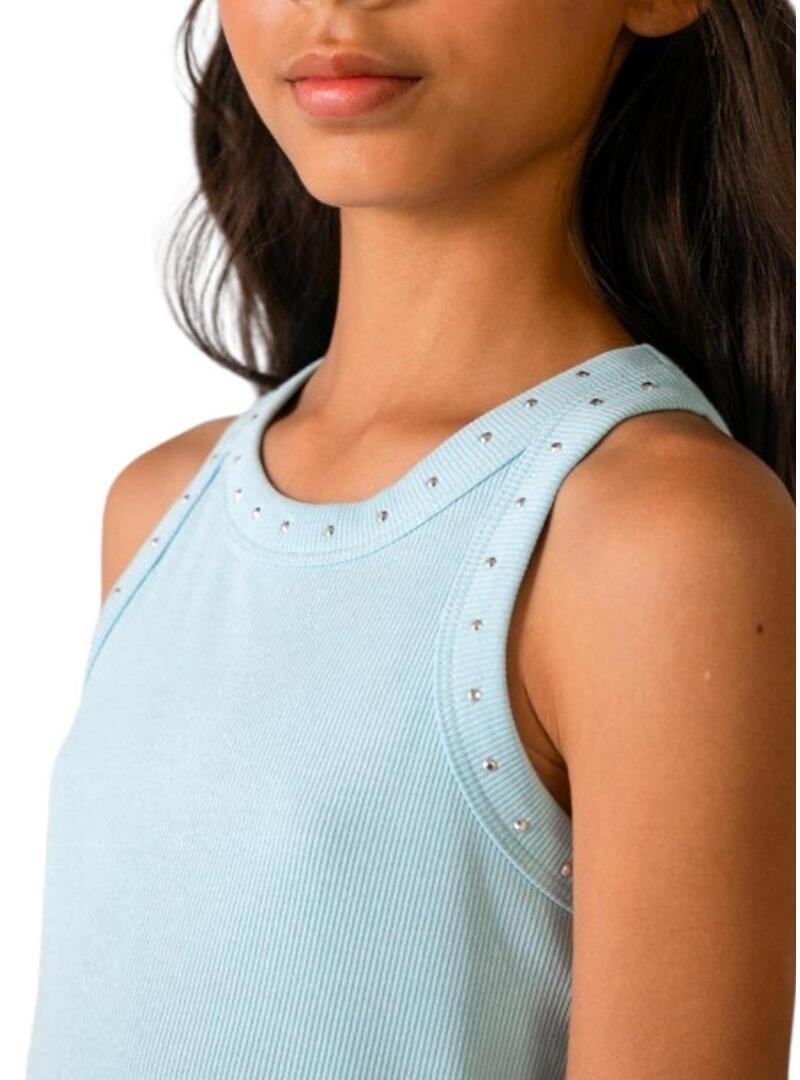 Camiseta Mayoral. Cor Azul. Gola redonda. Detalhe de tachas. Coleção Cerimônia. Design em alças.