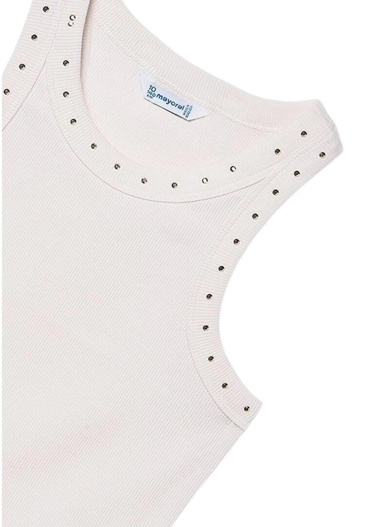Camiseta Mayoral. Cor branca. Gola redonda. Com detalhes em canelado. Tachas no pescoço. Manga curta.