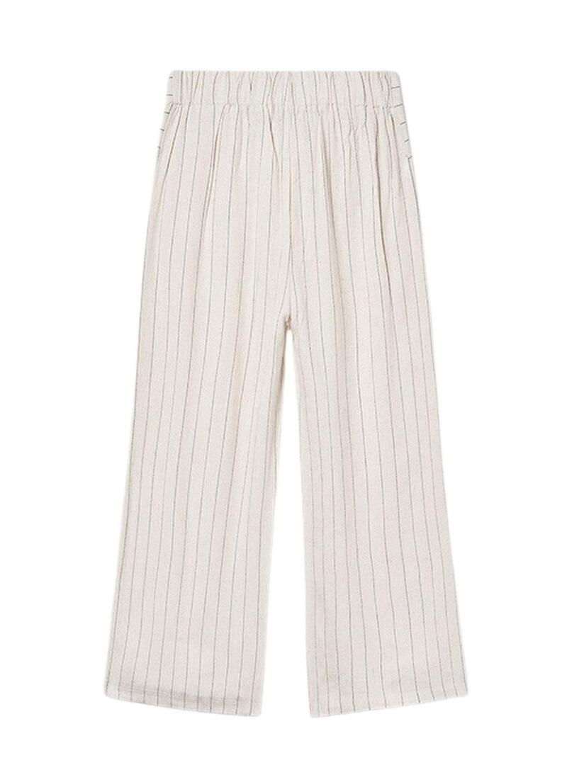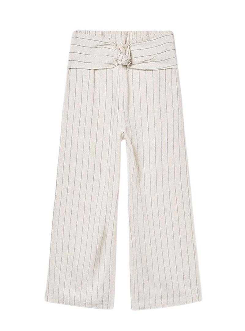 Calça Mayoral. Cor cru. Listras finas. Cintura elástica. Com nó na frente. Perna larga. Corte reto. Estilo fluido.