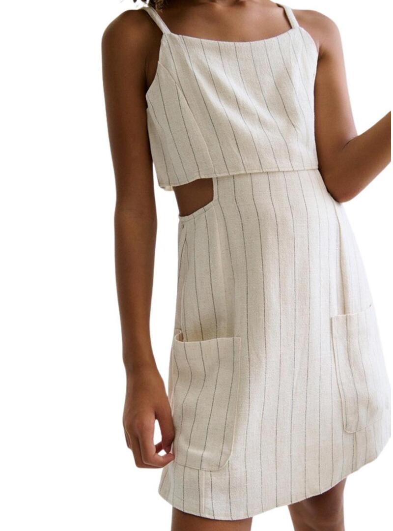 Macacão de prefeito. Cor cru. Listras finas. Alças finas. Decote reto. Aberturas laterais na cintura. Fechamento com zíper na frente. Bolsos frontais. Perna curta. Corte reto.