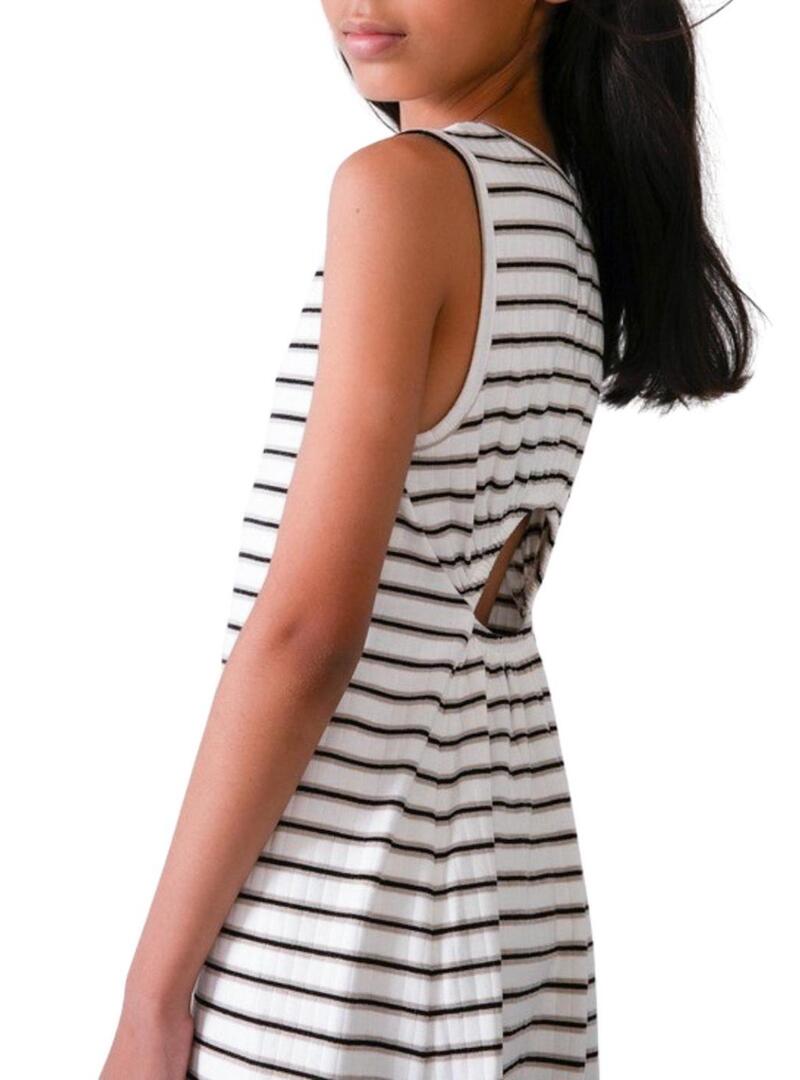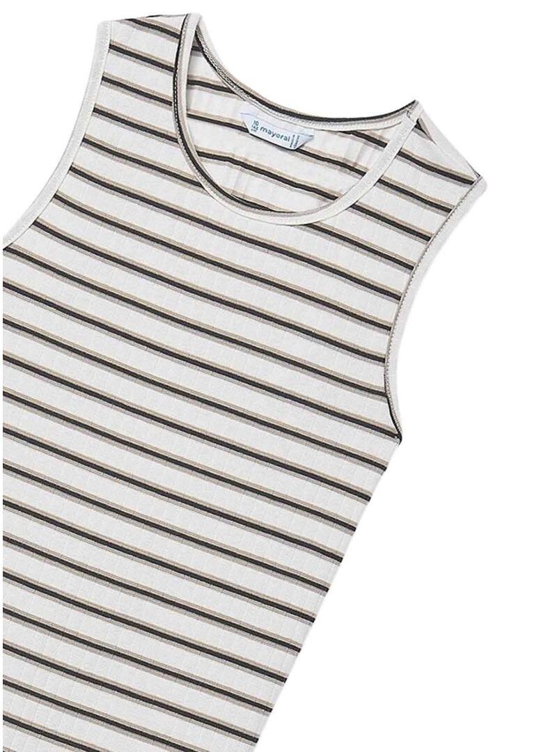 Vestido Mayoral. Ponto canelado. Cor cru. Listras pretas. Gola redonda. Sem mangas. Comprimento midi. Aberturas laterais na barra. Costas com abertura. Corte ajustado.