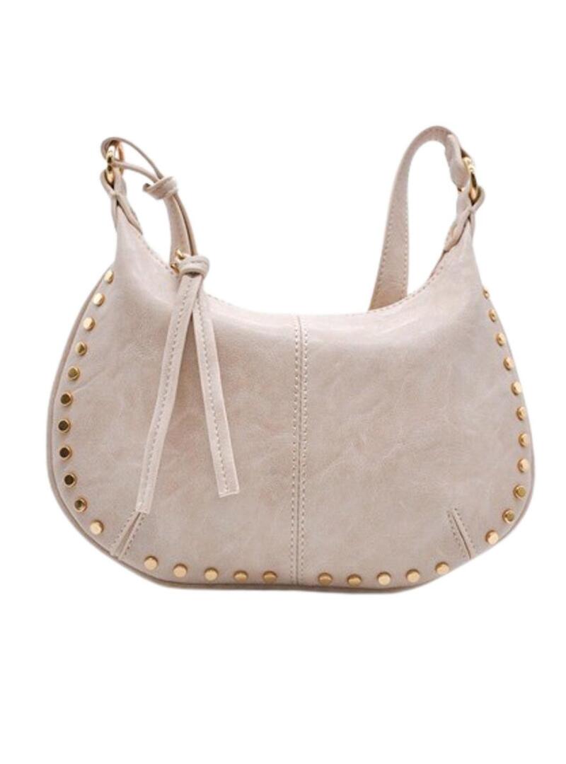 Bolsa Mayoral. Cor bege. Efeito de pele. Formato meia lua. Alça curta ajustável. Detalhe de tachas douradas. Acabamento liso. Fecho superior. Estilo compacto.