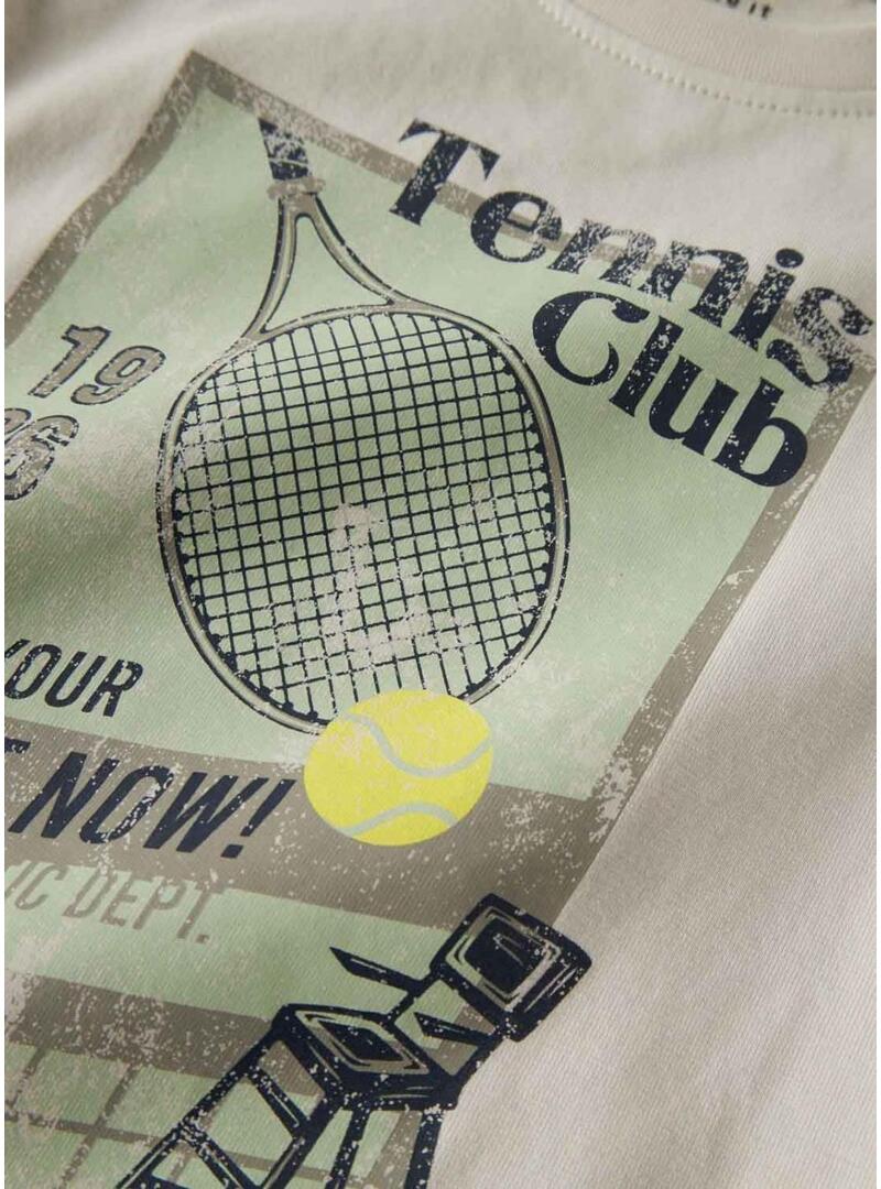 Camiseta Name It. Cor bege. Gola redonda. Manga comprida. Estampado frontal Tennis Club. Design com raquete e bola. Corte reto. Estilo casual.