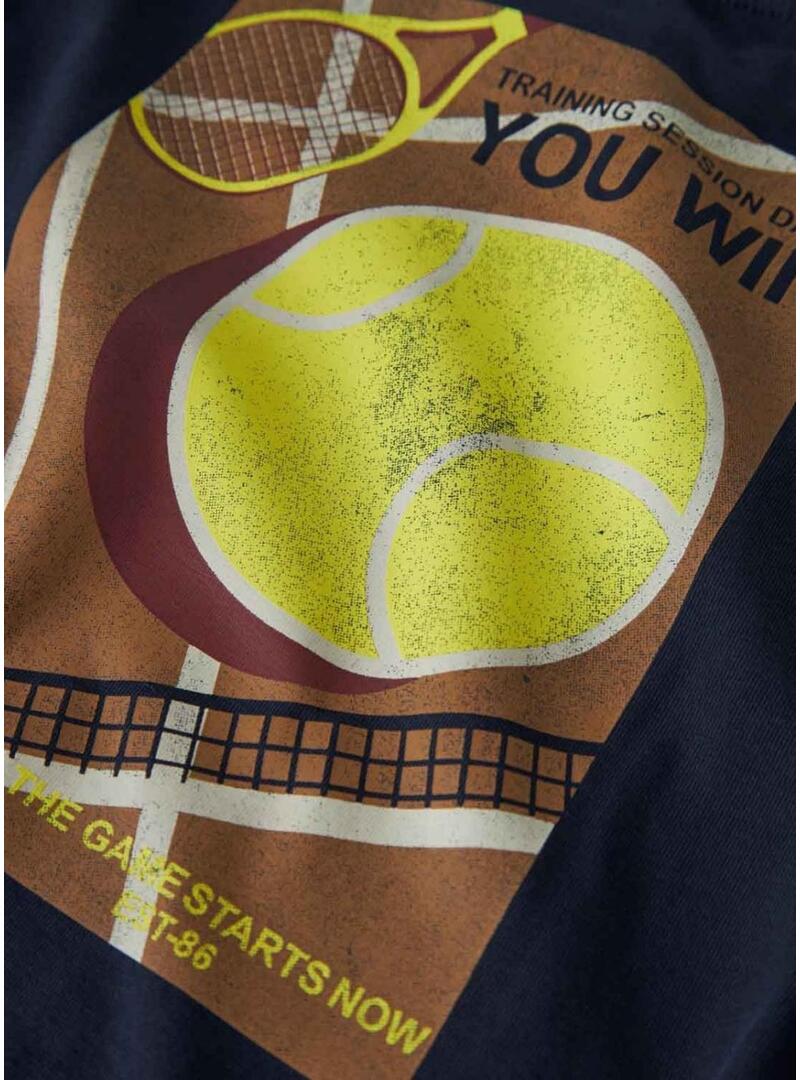 Camiseta Name It. Cor azul marinho. Gola redonda. Manga comprida. Estampa frontal e traseira. Design com motivo de tênis. Texto You Win. Corte reto. Estilo casual.