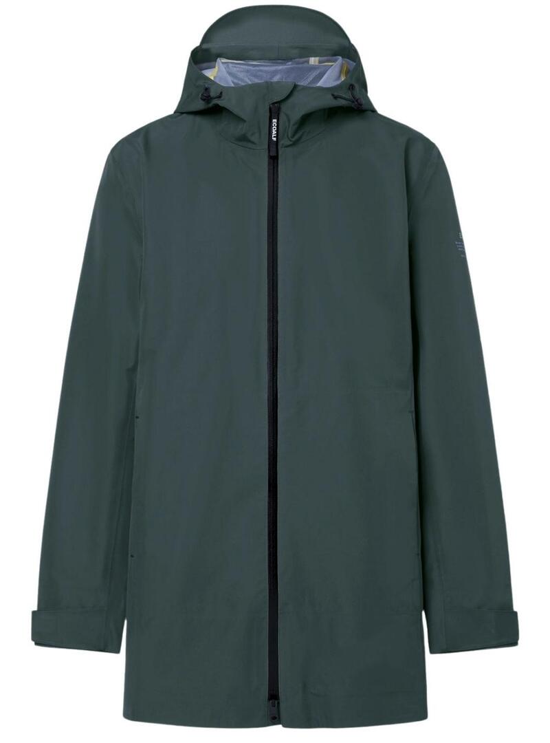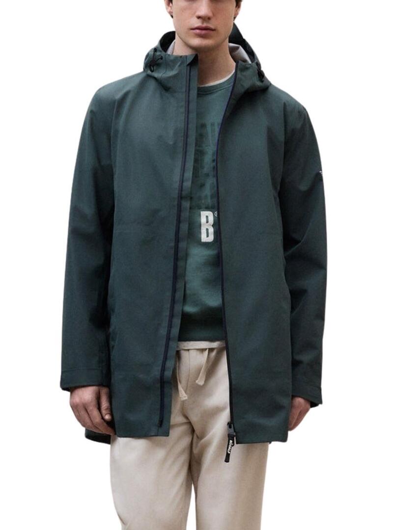 Casaco Ecoalf. Modelo Bald. Cor verde. Impermeável 3K. Fabricado com tecido reciclado. Corte regular. Fecho frontal com zíper. Bolsos frontais. Com capuz ajustável com cordão e pontas. Mangas ajustáveis com velcro. Respirável 3K. Livre de PFCs. O modelo veste tamanho L.