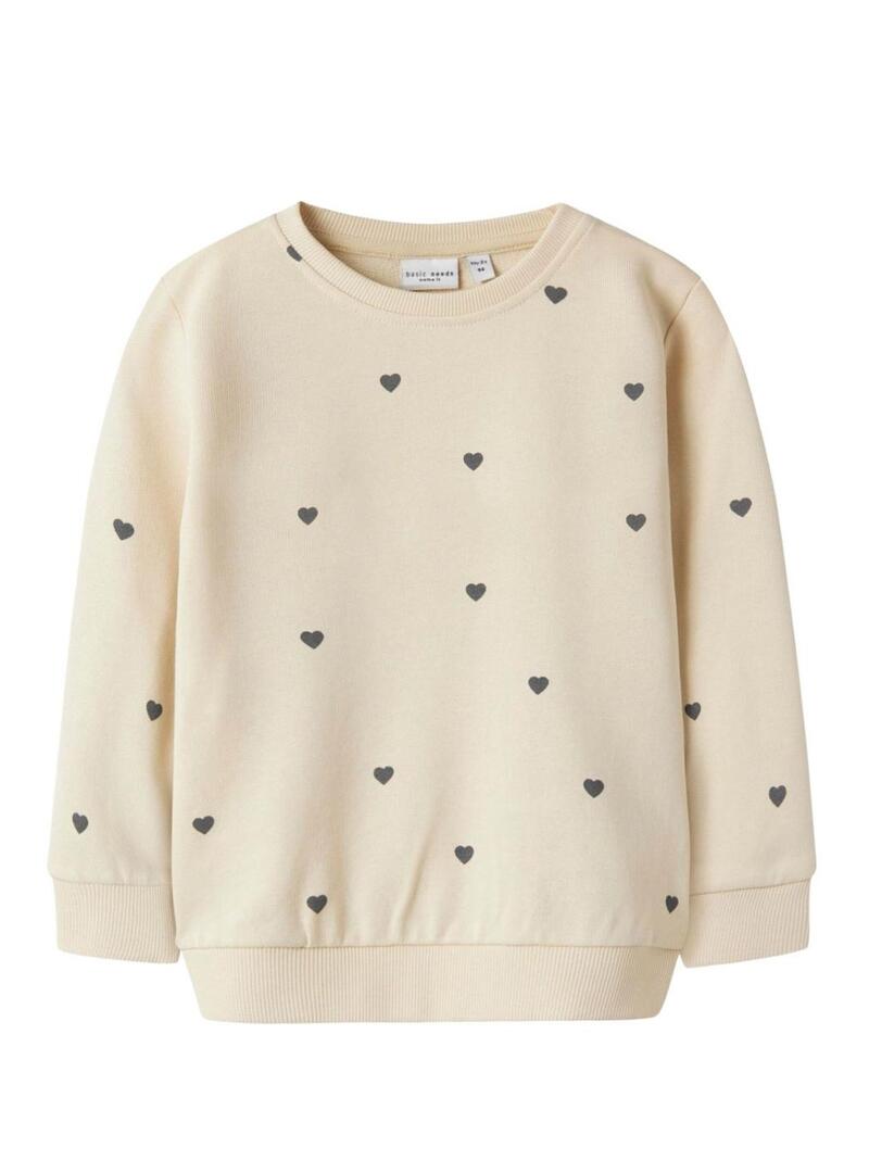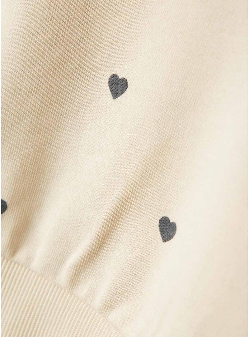 Moletom Name It. Cor bege claro. Estampa de corações. Gola redonda. Manga comprida. Punhos canelados. Barra canelada. Corte regular. Composição: 100% algodão.