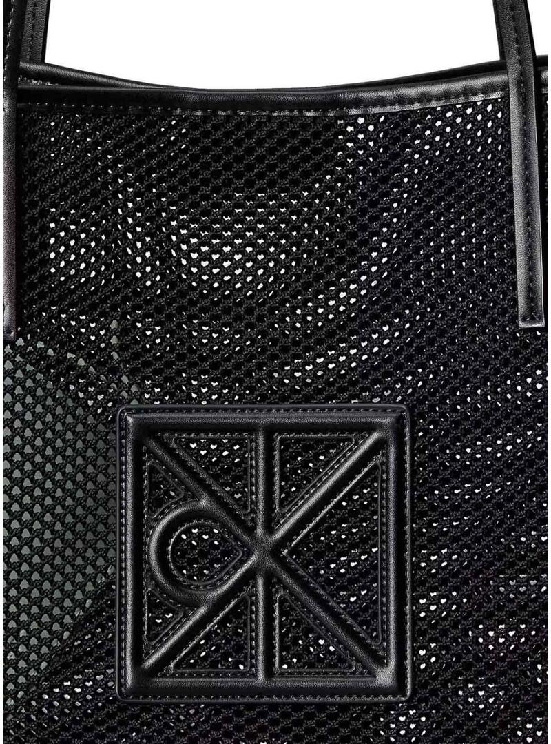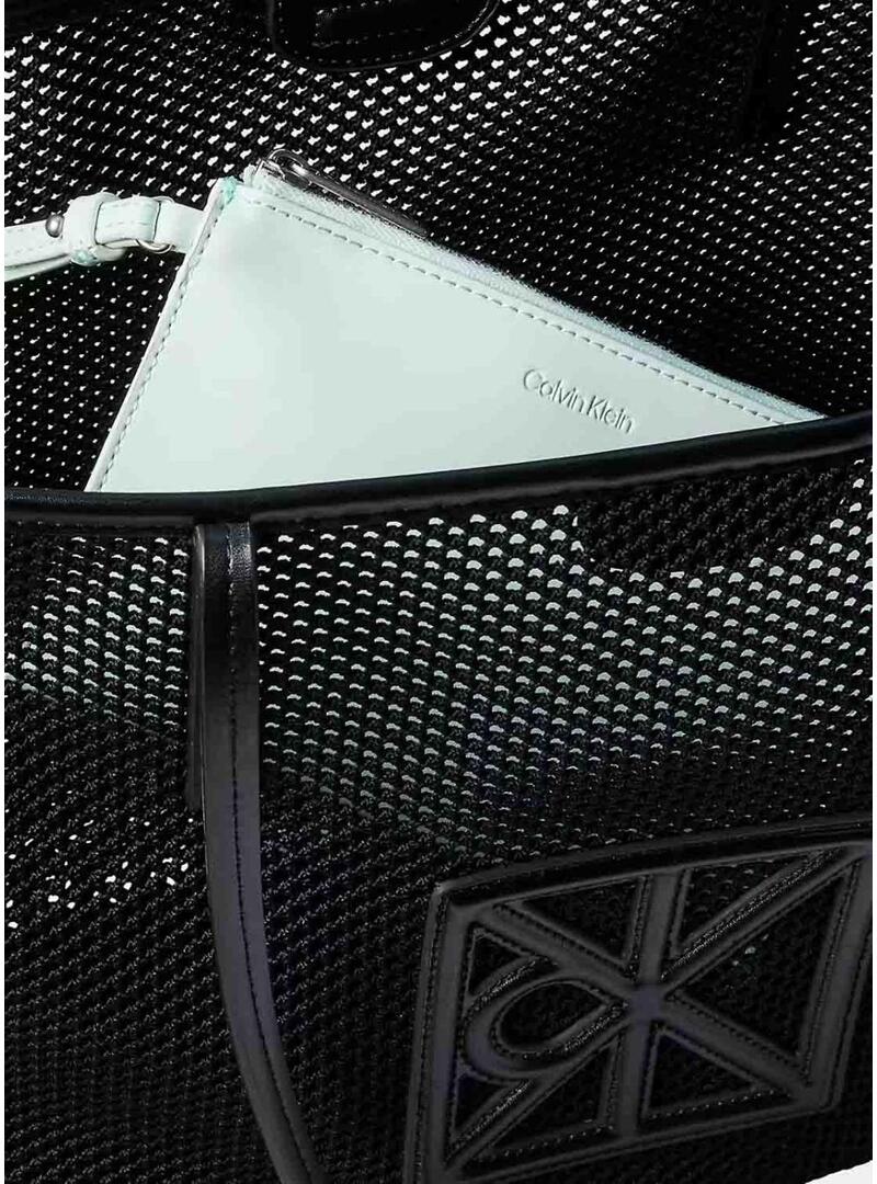 Bolsa Calvin Klein Jeans. Modelo Emblem Mesh. Cor preta. Exterior em malha de poliéster. Alças de mão duplas. Necessaire interna com zíper em cor branca. Design com logo em relevo. Dimensões: 13 cm, 25,5 cm e 3 cm. Comprimento da alça: 29 cm.