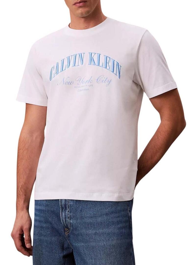 Camiseta Calvin Klein Jeans. Modelo March. Cor branca. Gola redonda. Manga curta. Ajuste reto. Logotipo bordado em linha azul na frente. Mensagem estampada abaixo do logotipo.