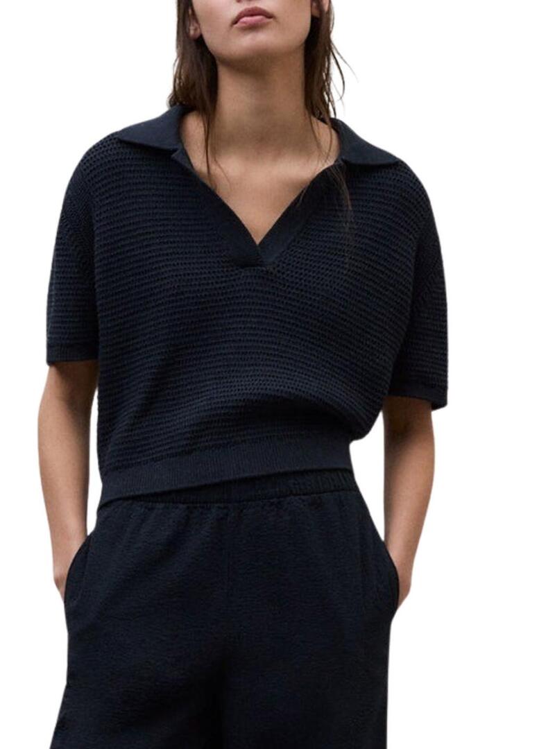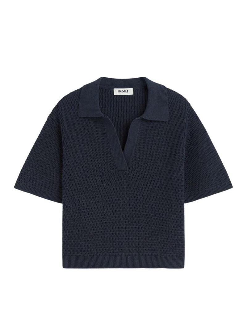 Camisola Ecoalf. Modelo Anna. Cor marinho. Corte relaxado. Gola polo em V. Ombros caídos. Manga curta. Acabamentos canelados. A modelo veste o tamanho S.
