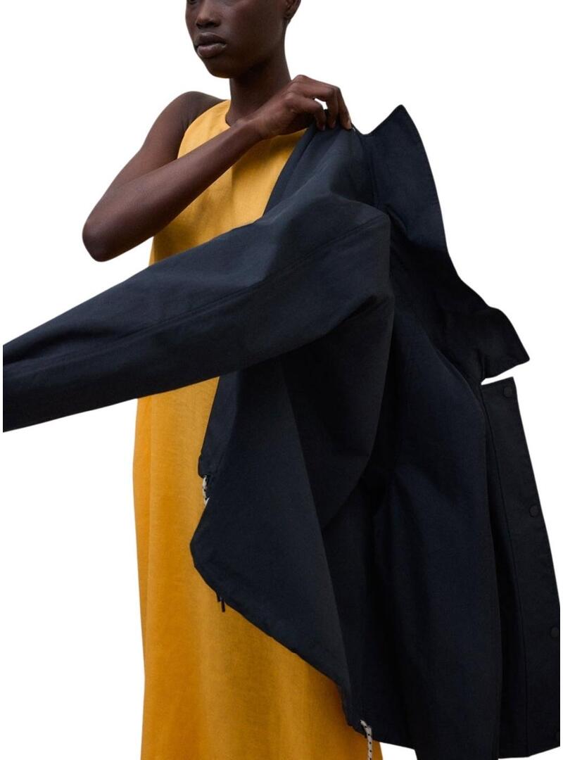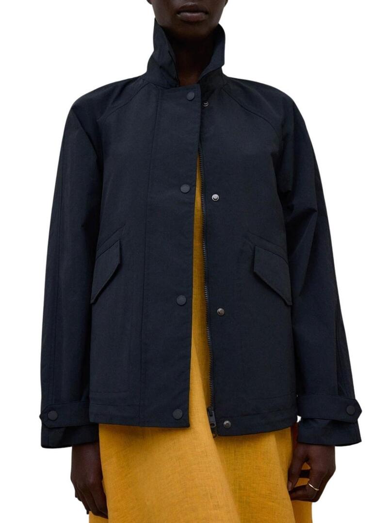 Jaqueta Ecoalf. Cor marinho. Modelo Major. Manga comprida. Fabricado com tecido reciclado. Corte relaxado. Comprimento até a anca. Fecho frontal com zíper oculto e botões. Bolsos laterais com aba. Logotipo da marca nas costas. Barra ajustável com cordão. O modelo veste o tamanho S.
