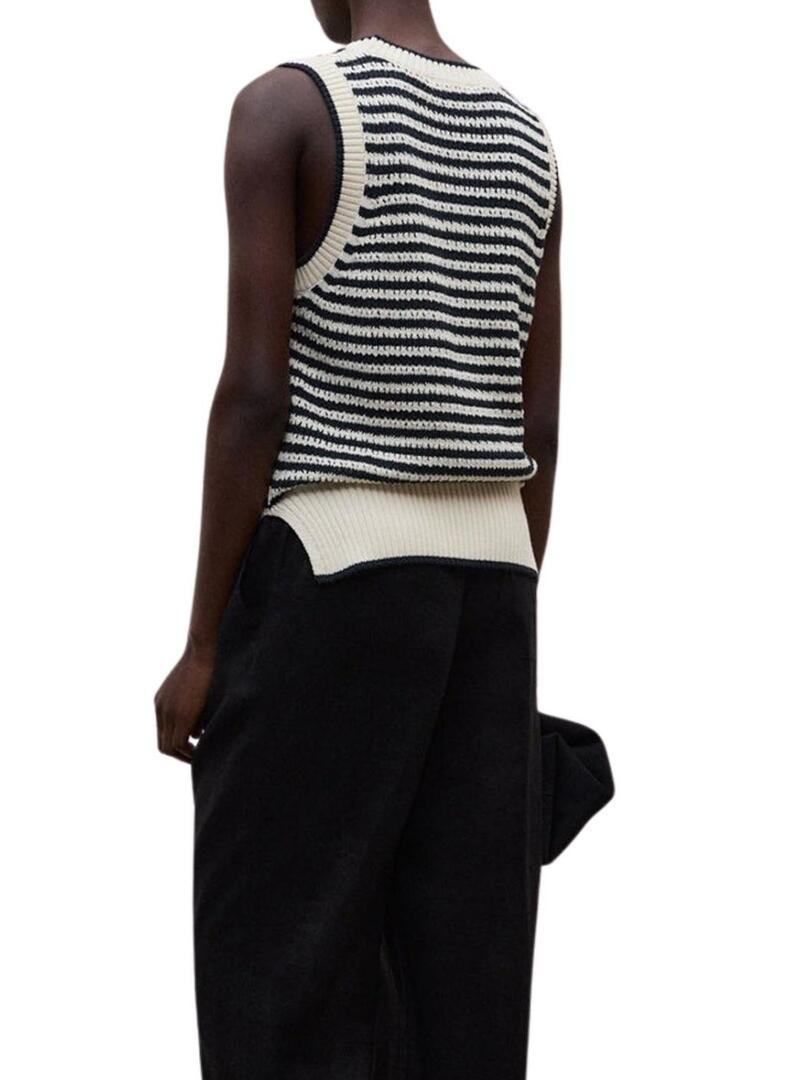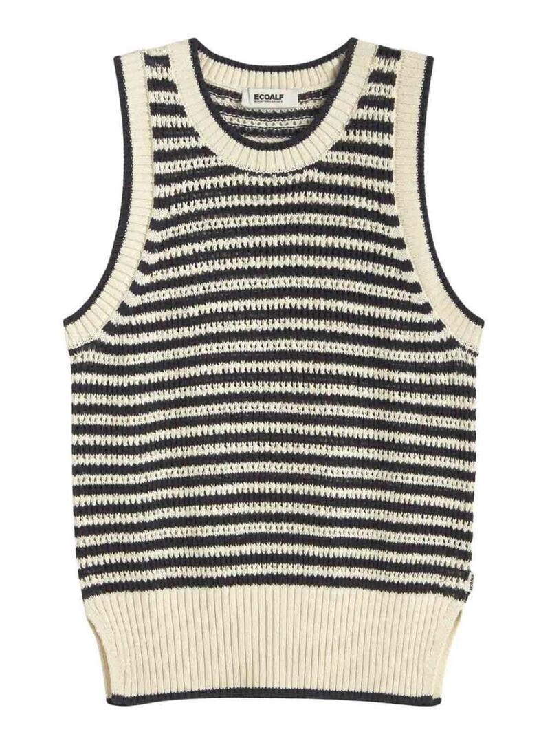 Camisola Ecoalf. Modelo Tulip. Estampa de listras. Ajuste regular. Gola redonda. Sem mangas. Acabamentos canelados. Aberturas laterais. A modelo está usando o tamanho M.