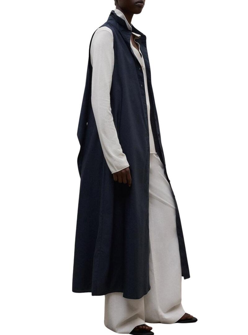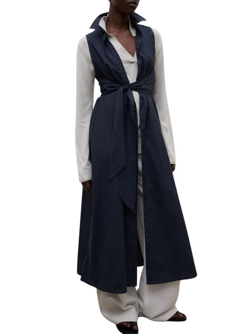 Vestido Ecoalf. Modelo Chiara. Cor azul marinho. Feito com TENCEL. Corte regular. Cinto do mesmo tecido. Fechamento frontal com botões. Bolsos nas laterais. Gola de camisa. Sem mangas. Comprimento midi. A modelo usa tamanho S.