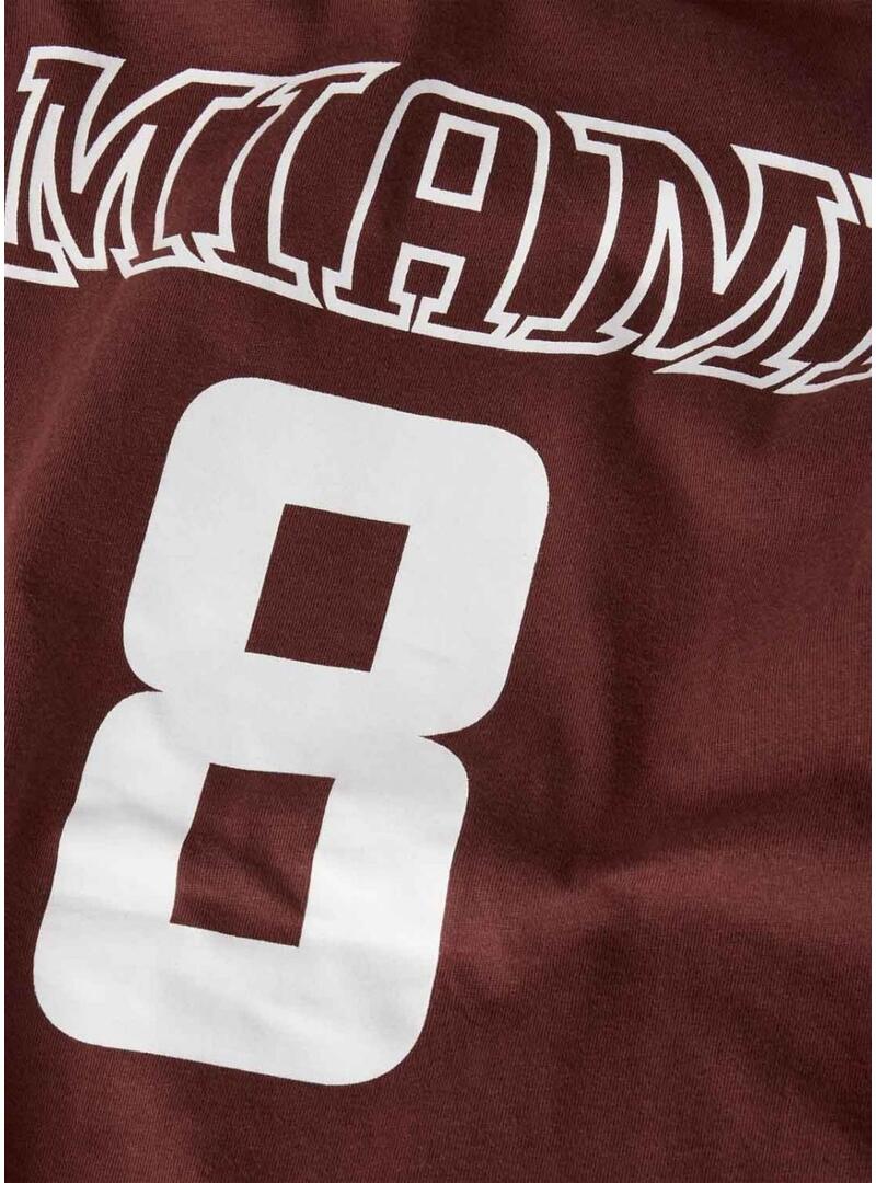 Camiseta Name It. Modelo Thomas. Cor marrom. Gola redonda em contraste. Manga curta. Tecido liso. Listras brancas nas mangas. Estampa traseira com texto e número. Sem fechamento. Corte reto.