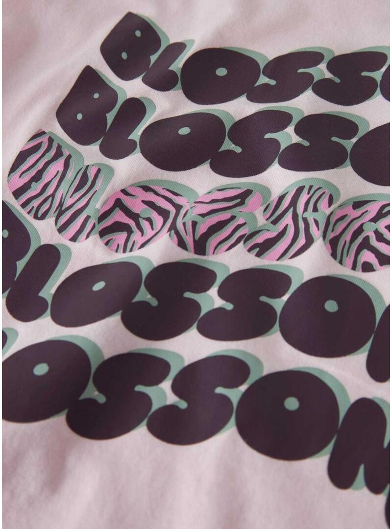 Camiseta Name It. Modelo Benna. Cor rosa claro. Gola redonda. Manga curta. Tecido liso. Estampa frontal com texto Blossom. Detalhe gráfico em contraste. Sem fecho. Corte reto.
