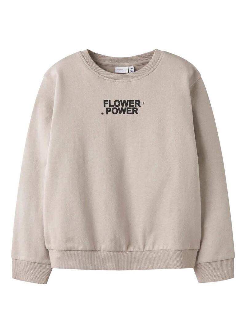 Moletom Name It. Modelo Difo. Cor bege. Gola redonda. Manga comprida. Tecido de pelúcia. Estampa pequena no peito. Estampa grande floral nas costas. Acabamentos canelados. Sem fecho. Corte reto.