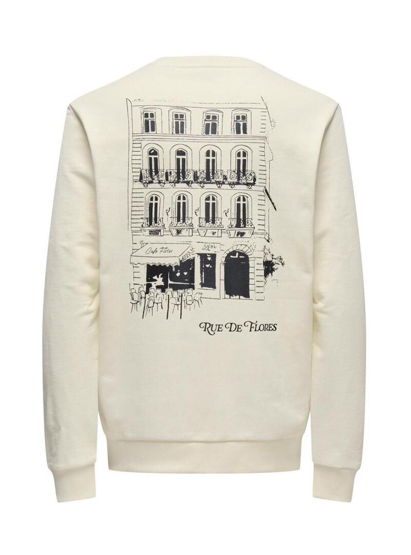 Moletom Only and Sons. Cor bege. Gola redonda. Manga comprida. Formato regular. Estampado no peito. Estampa parisiense nas costas. O modelo está usando o tamanho L.