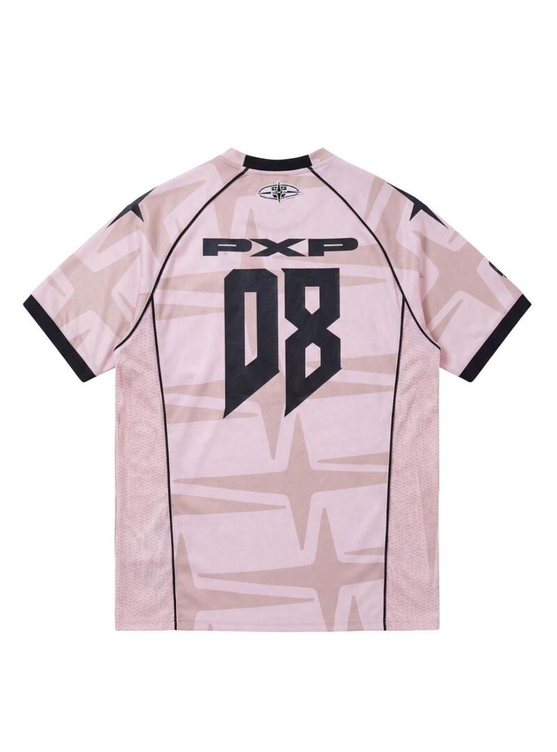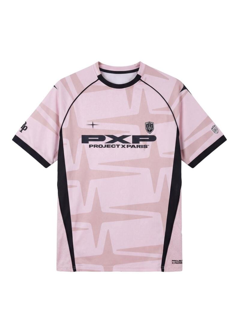 Camiseta Project x Paris. Cor rosa. Corte regular. Estampada. Gola redonda. Manga curta raglã. Painéis laterais de malha. Detalhe de letras na parte da frente e nas costas. O modelo veste o tamanho L.
