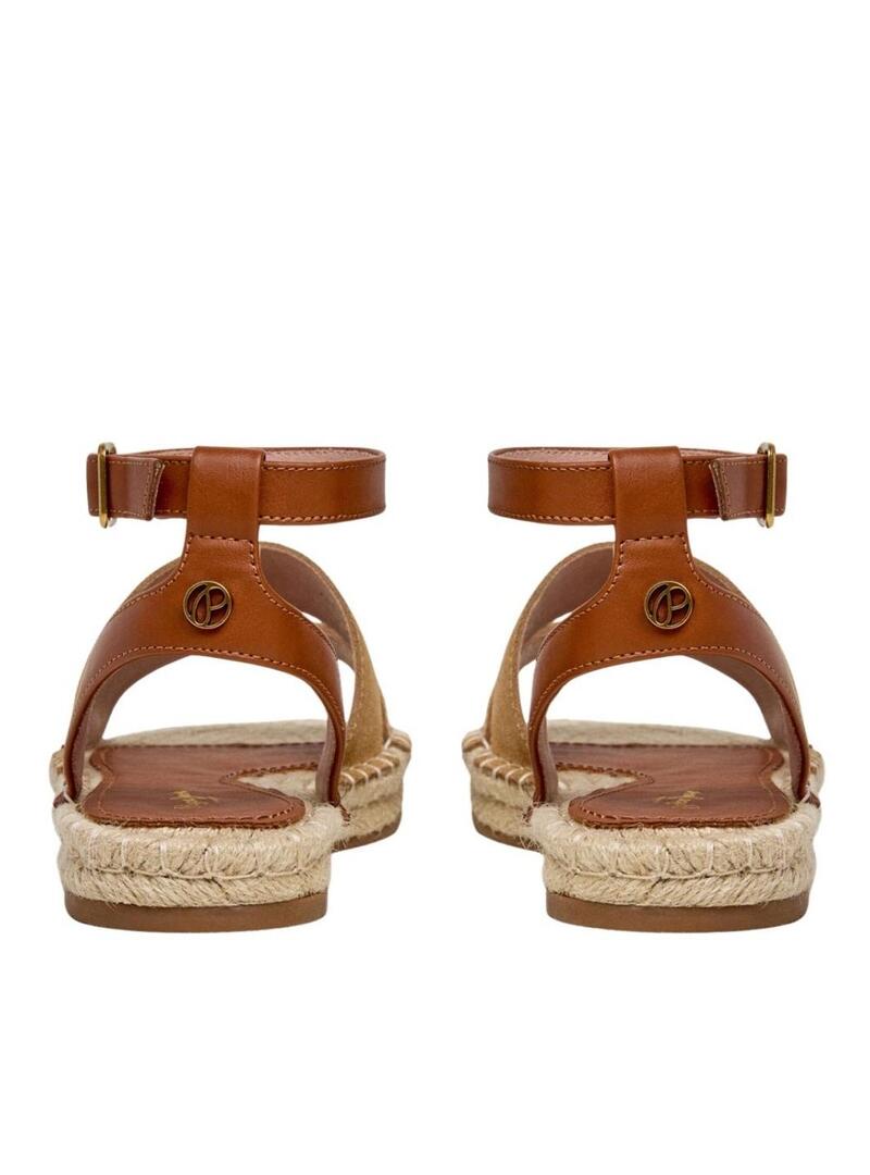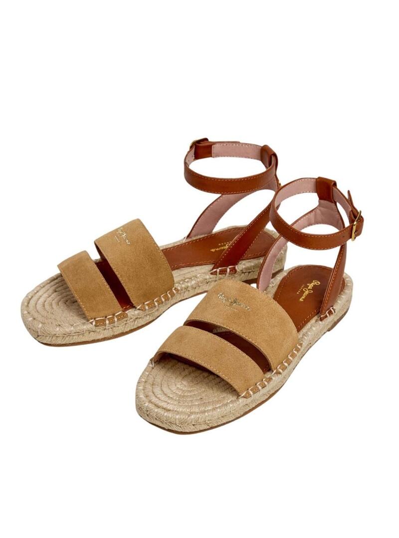 Sandálias Pepe Jeans. Modelo Auri. Cor camel. Dupla tira de camurça no peito do pé com logo. Fecho com fivela metálica no tornozelo. Palmilha forrada com logo estampado. Sola plana de borracha antiderrapante. Entressola de juta natural.