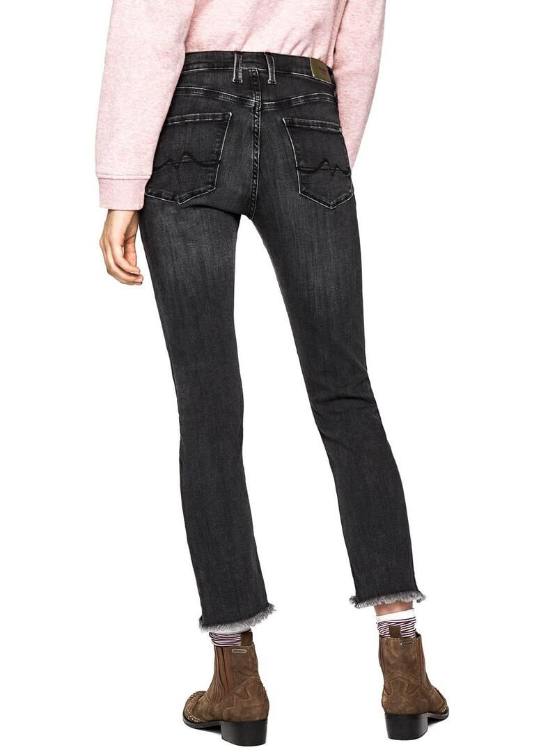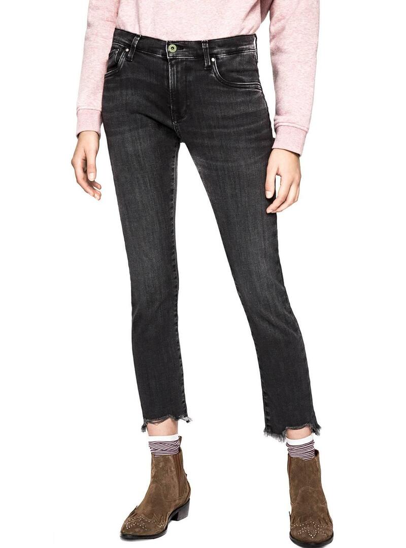 Jeans Pepe Jeans. Modelo Vitória. Cor preta. Efeito desgastado Cintura média Perna estreita Tecido macio. 5 bolsos Baixos desgastados. O modelo está usando tamanho 27.