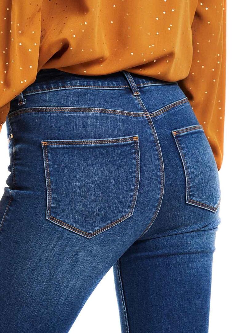 Jeans Vila. Modelo Vicomit Felicia. Azul. Ajuste Skinny. Cinco bolsos. Fecho de botão e fecho de correr. Lavagem escura. Formato cabido. Cintura média. O modelo usa tamanho S.