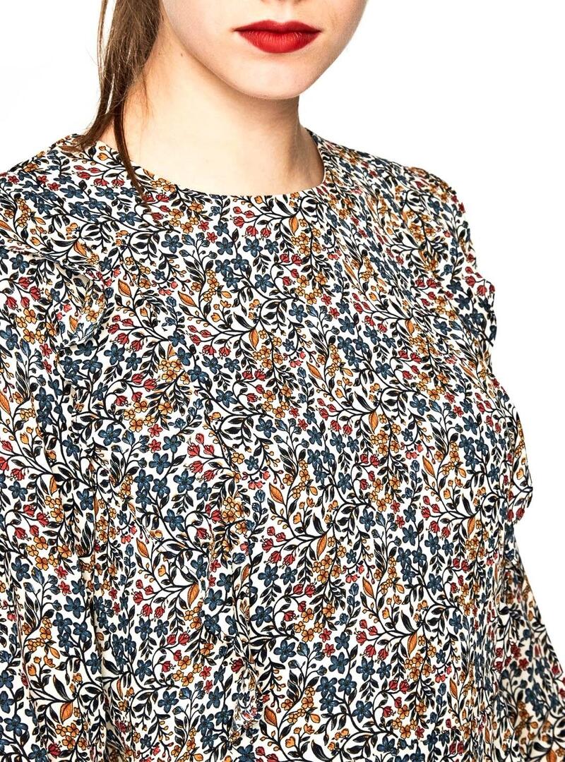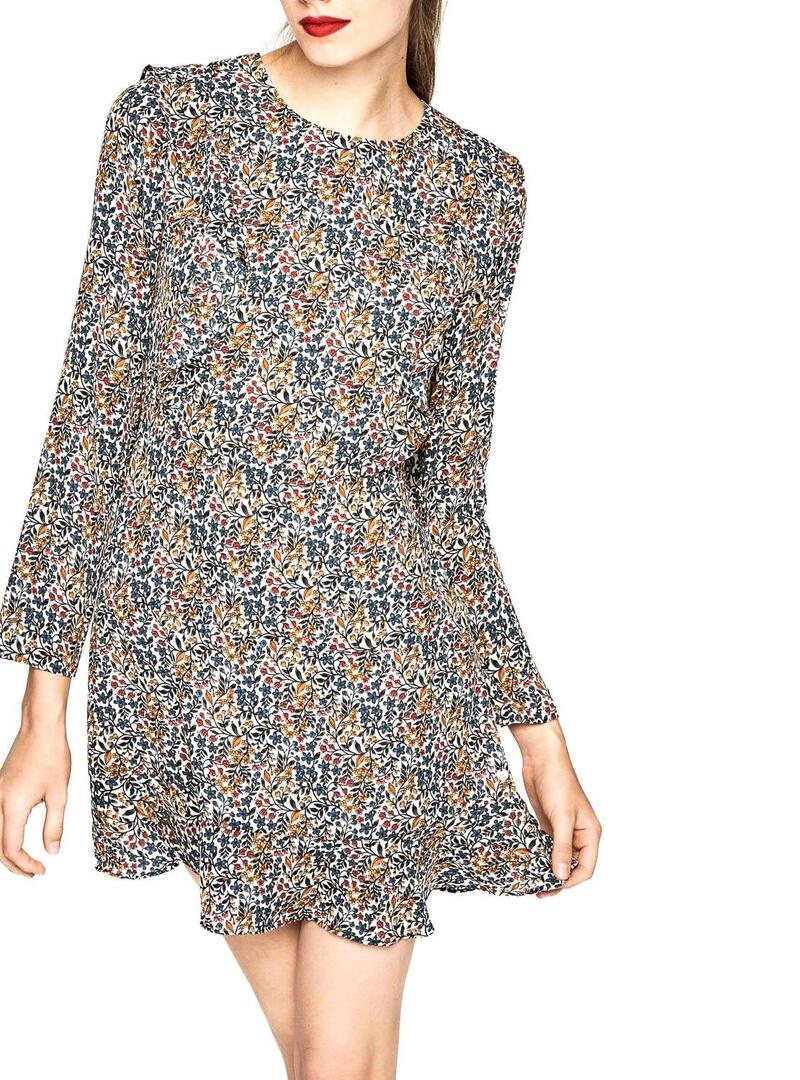 Vestido Pepe Jeans. Modelo Tatina. Estampado floral. Decote redondo. Manga comprida. Tecido leve. Formato curto Corte na cintura. Fecho con traseiro e botão. Sob o volante con. A modelo está usando tamanho S.