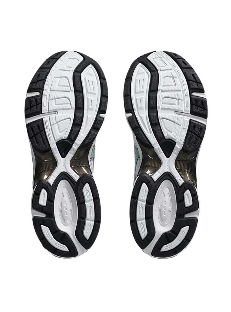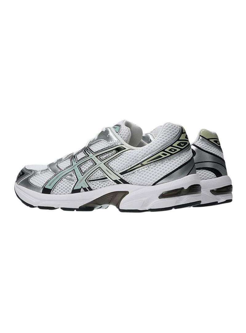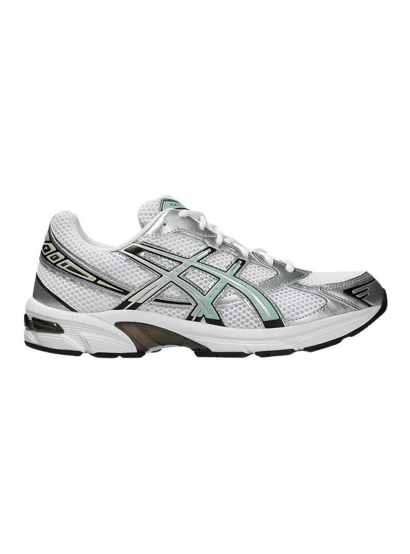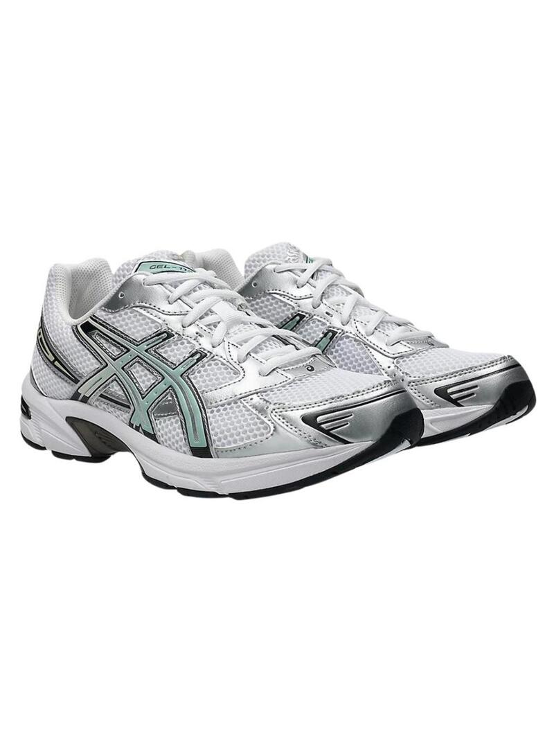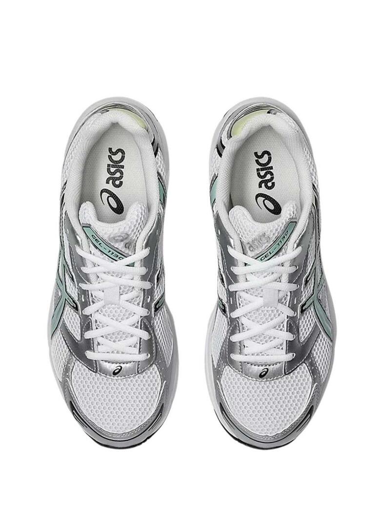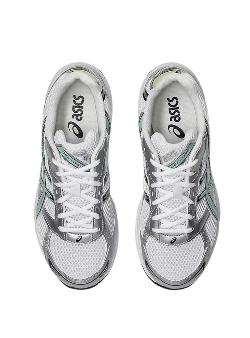 Sapatilhas Asics. Modelo Gel 1130. Cor branca. Painéis de malha. Painéis em prateado. Detalhes em azul turquesa e bege. Fecho com cordões. Sola de borracha. Estilo dad sneakers.